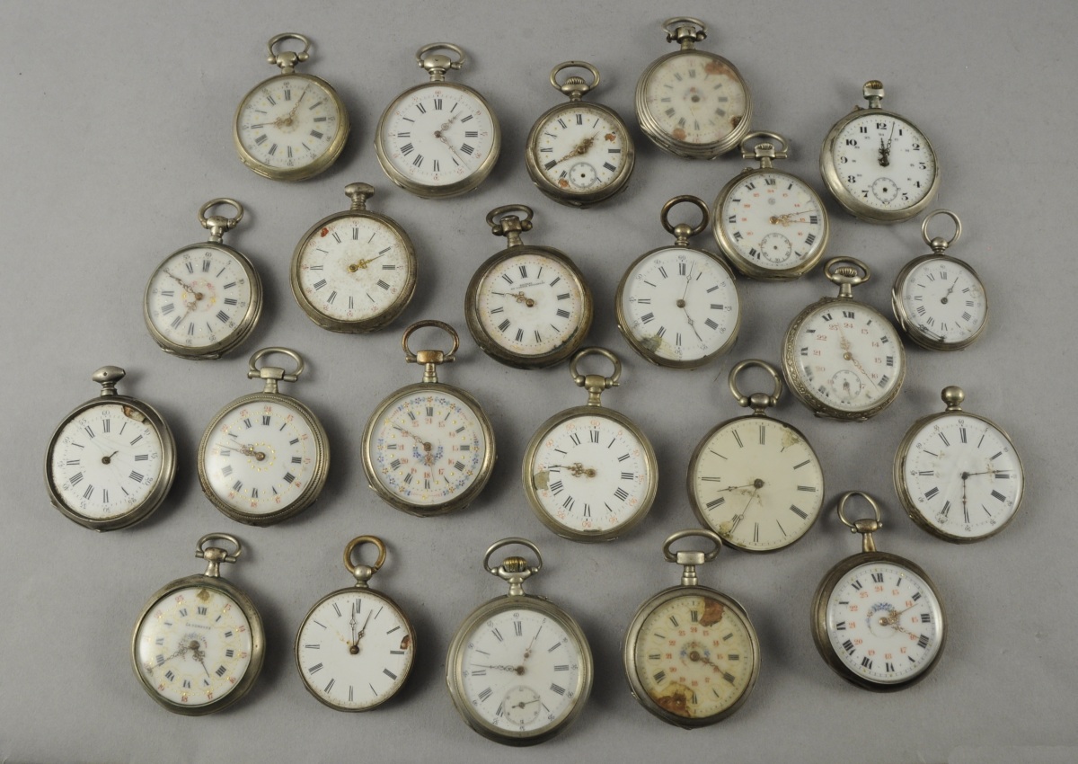 LOT DE 23 MONTRES DE GOUSSET en argent, à clef ou à remontoir au pendant. Il comprend notamment une signée "La Semeuse", plusieurs à cadran double, une dont le dos du boîtier est ciselé d'une vue de l'église de St Hilaire du Harcouët, plusieurs dont le cadran est émaillé de guirlandes de fleurs polychromes, deux dont le dos du boitier est ciselé d'un cheval...