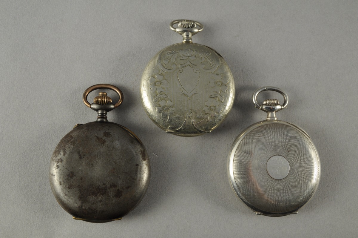 -La troisième, en argentan, à double cadran émaillé blanc indiquant les heures en chiffres arabes et les secondes. Le dos du boîtier à décor d'un écu encadré de guirlandes de fleurs, volutes et feuillages stylisés. Mécanisme à échappement à ancre marqué "15 jewels / two adjustments".
