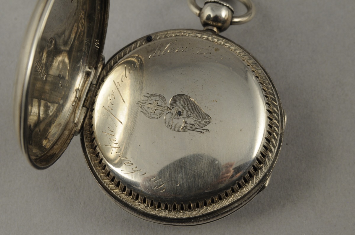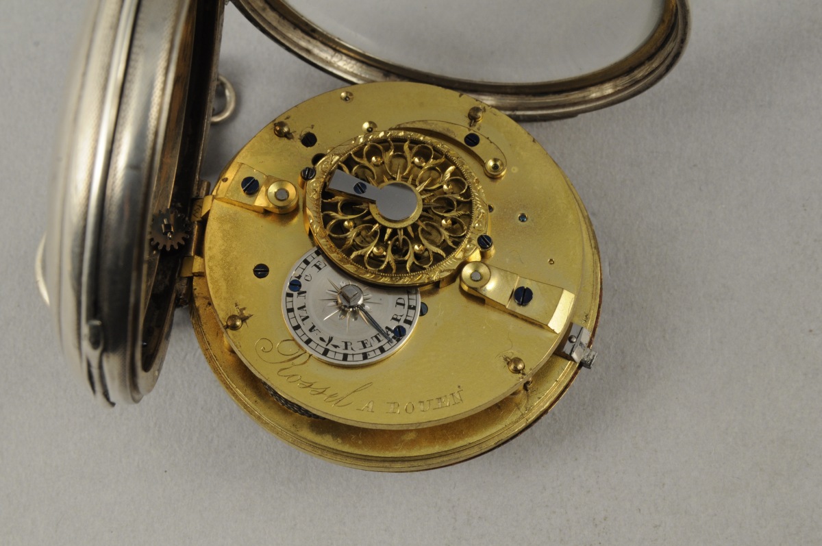 MONTRE À COQ, à sonnerie, en argent. Le cadran émaillé blanc indiquant les heures en chiffres arabes. Le cache-poussière à bord ajouré ciselé du Sacré Coeur enflammé et gravé "In charitate perpetua dilexi te". Coq à décor ajouré de rinceaux. Signée "Rossel à Rouen". État de marche. Poinçons Vieillard et Écrevisse, 1822-1838.