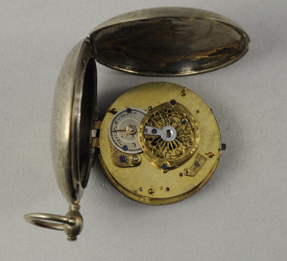 MONTRE À COQ, en argent. Le cadran émaillé blanc indiquant les heures en chiffres romains. Boîtier ciselé d'un bouquet de fleurs sur fond guilloché dans un encadrement de volutes. Coq à décor ajouré de rinceaux. Maîtres-Orfèvres: PW, un losange et XB. Poinçon Minerve deuxième titre.