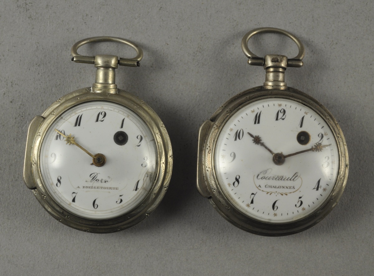 LOT DE 2 MONTRES À COQ en argent. Le cadran émaillé blanc indiquant les heures en chiffres arabes. Le coq à décor ajouré de rinceaux.