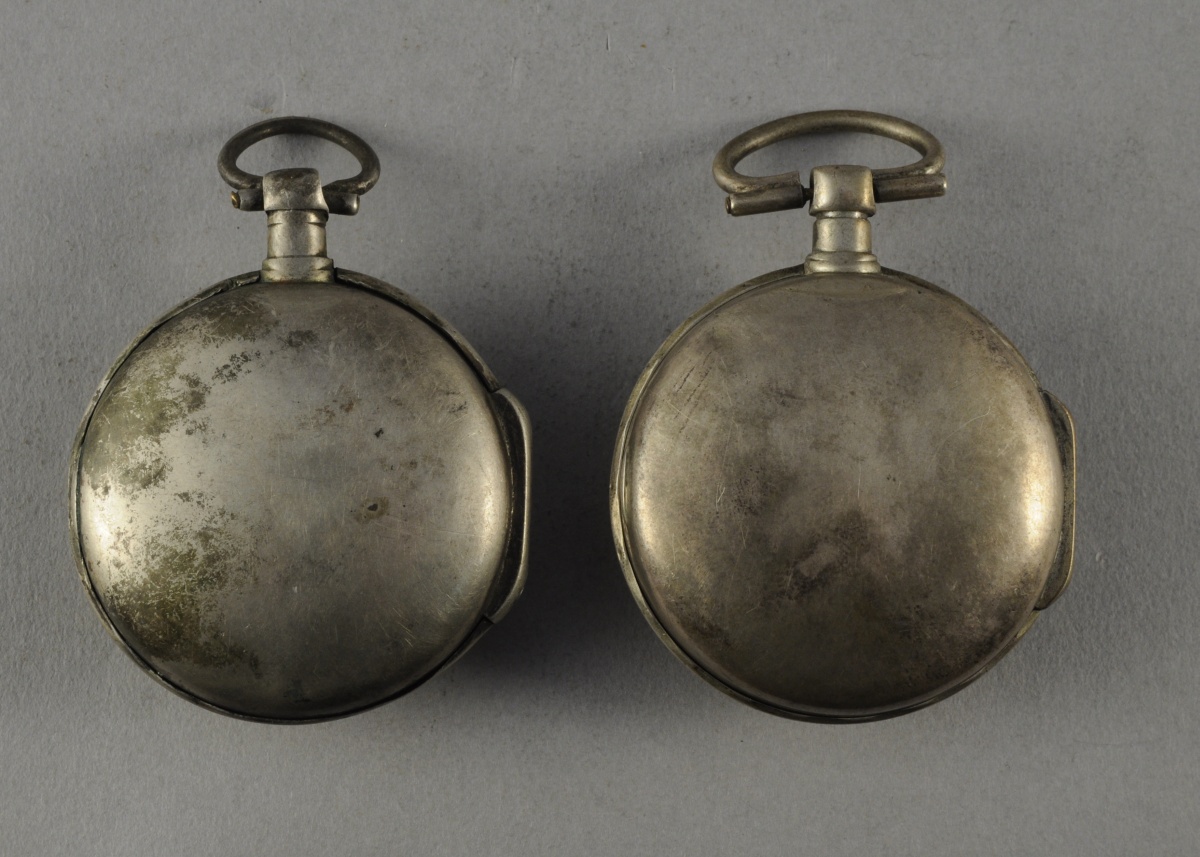 -La seconde: Maître-Orfèvre CE. Poinçon Crabe. Diam. 4,7 cm. Poids brut: 80,4 g. (rayures à l'émail, une aiguille accidentée)