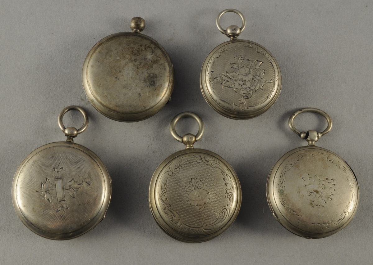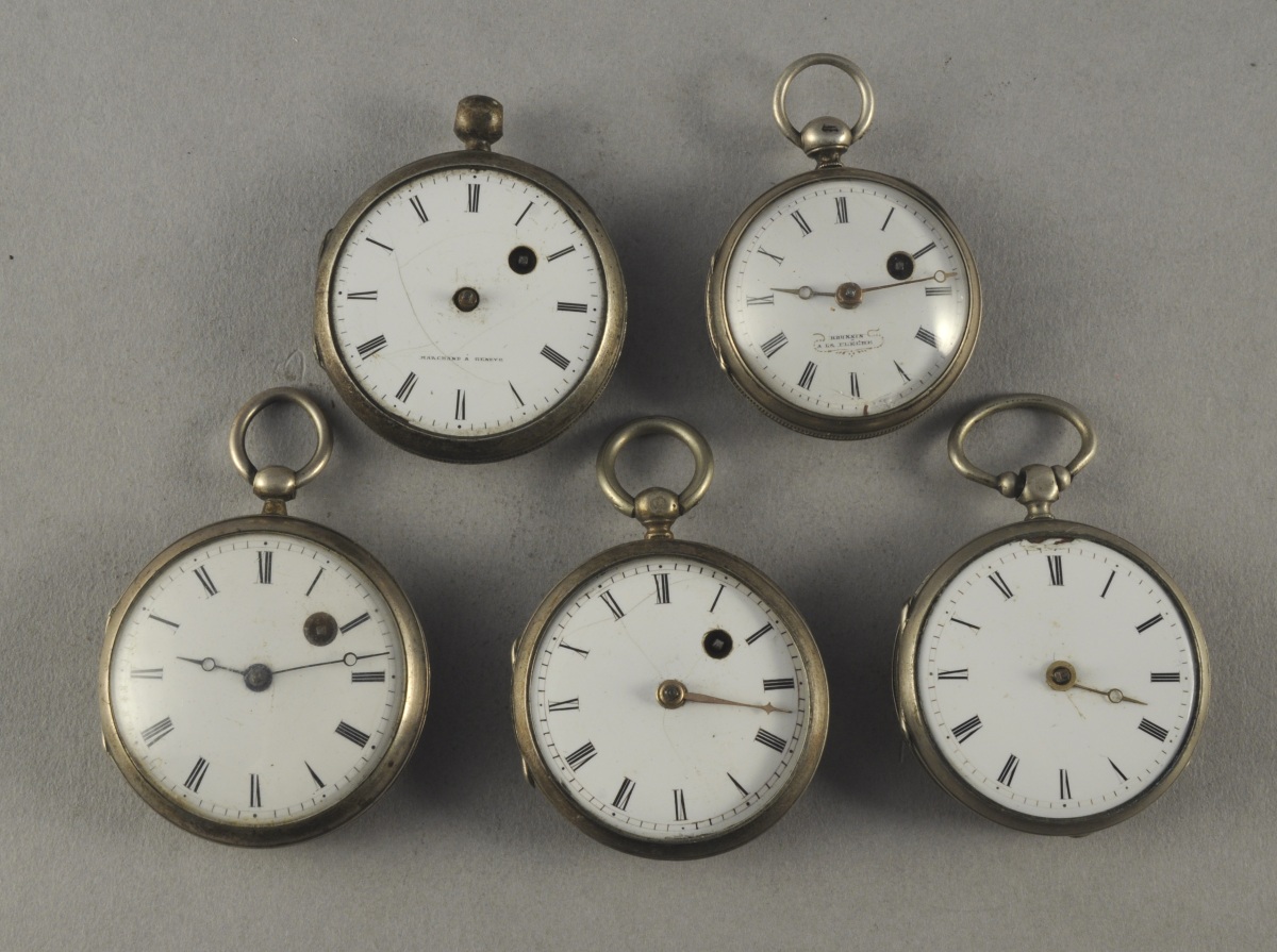 LOT DE 5 MONTRES À COQ en argent. Le cadran émaillé blanc indiquant les heures en chiffres romains. Le coq à décor ajouré de rinceaux.