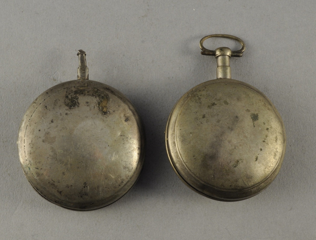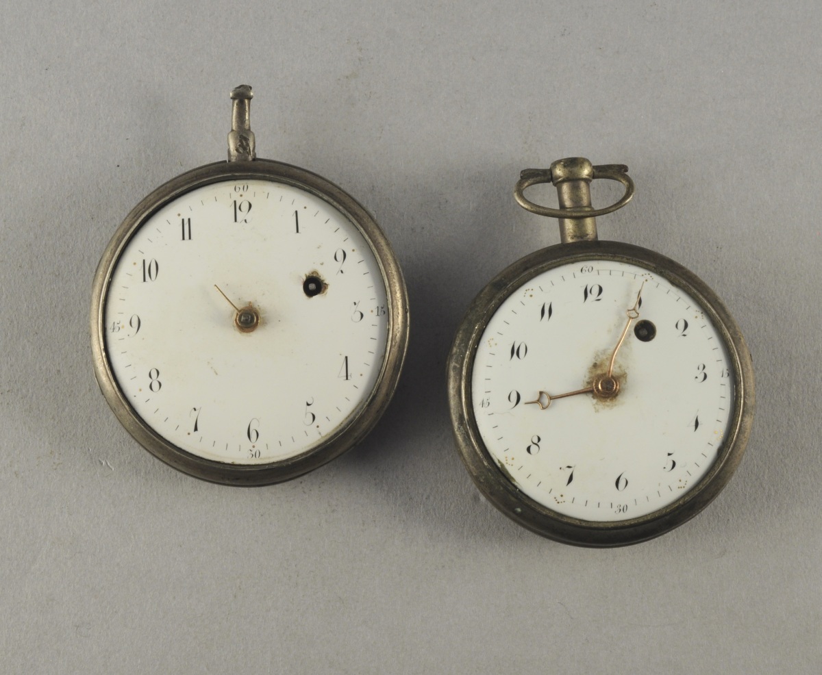 LOT DE 2 MONTRES À COQ en argent. Le cadran émaillé blanc indiquant les heures et les quarts en chiffres arabes. Le coq à décor ajouré de rinceaux.