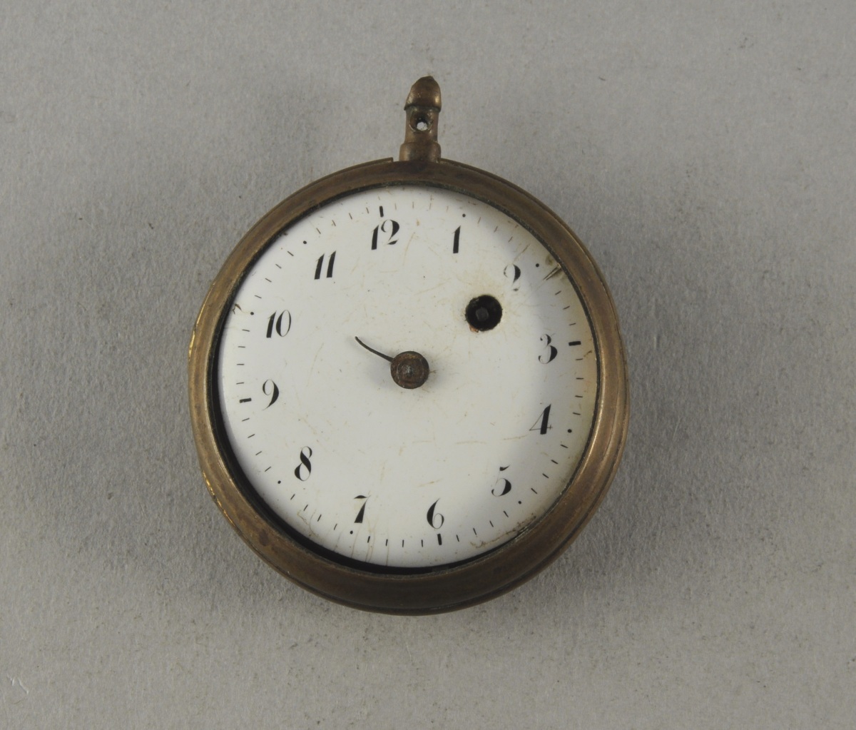 JOINT: MONTRE À COQ en laiton anciennement doré. Le cadran émaillé blanc indiquant les heures en chiffres arabes. L'intérieur du boîtier poinçonné de croix et marqué "LETON". Coq à décor ajouré de rinceaux. XIXème. Diam. 4,6 cm. (en l'état)