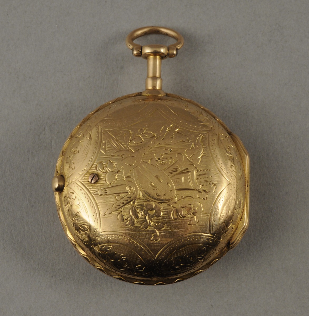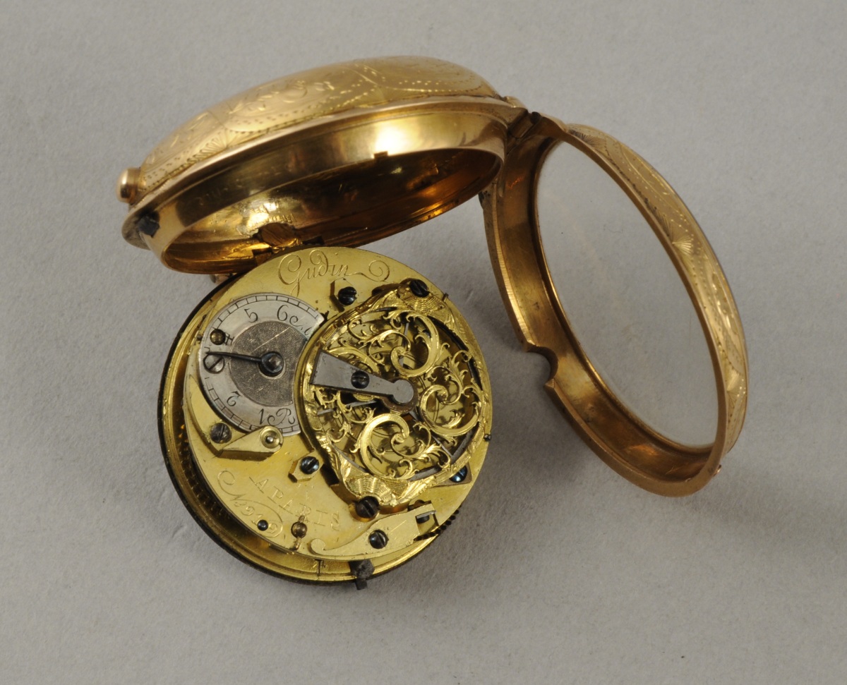 MONTRE OIGNON en or jaune à clef. Boîtier à décor d'oiseaux se becquetant sur fond de trophée au luth, torche et carquois dans un entourage d'entrelacs et de couronne de roses. Frise ondée sur le bord. Cadran émaillé blanc indiquant les heures en chiffres romains, les parties de 5 minutes en chiffres arabes, et gradué pour les minutes. Aiguilles en or à décor ajouré fleur-de-lysé et de rinceaux. Coq en or ajouré de volutes à feuilles. Mouvement signé " Gudin à Paris ", "919.