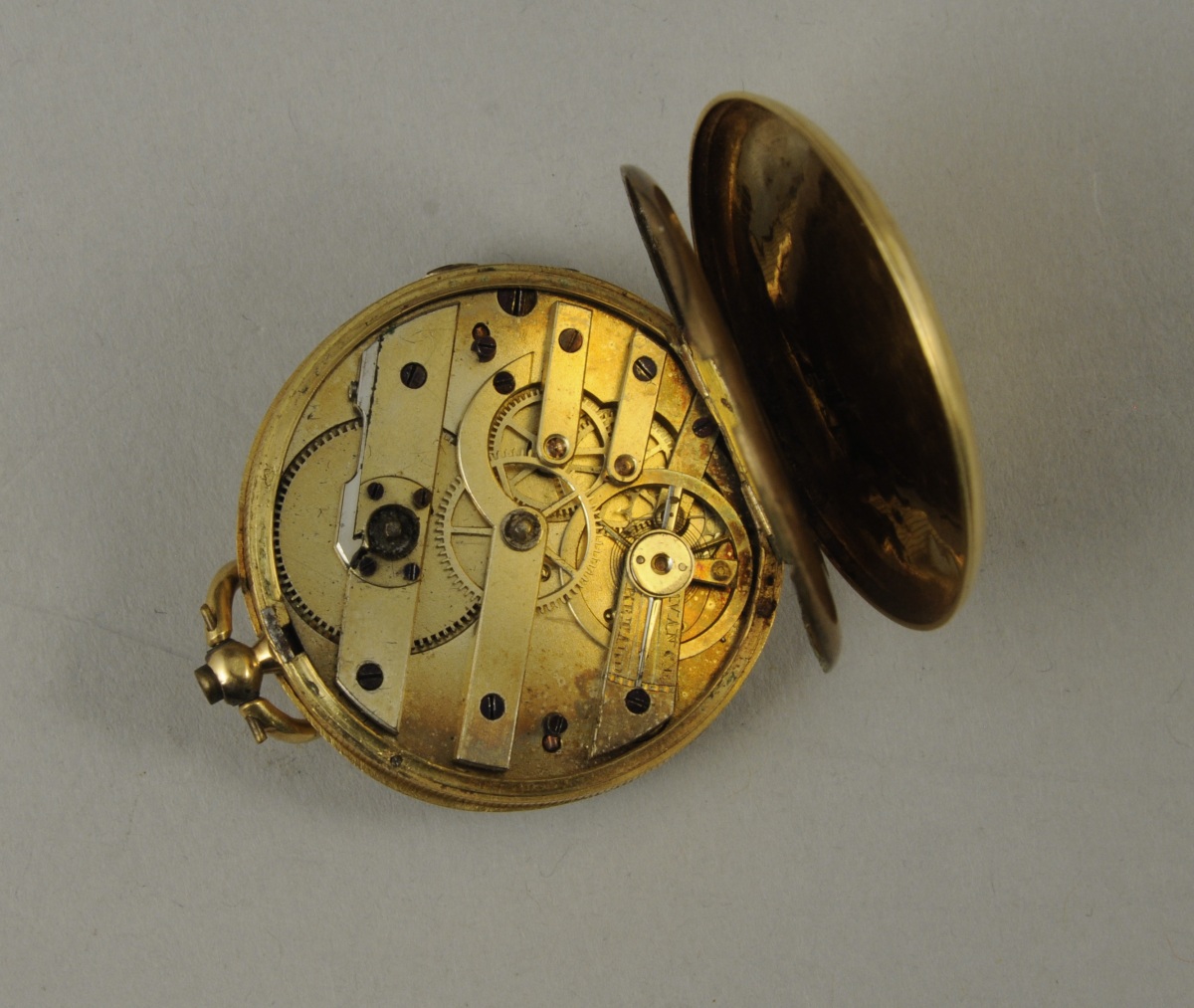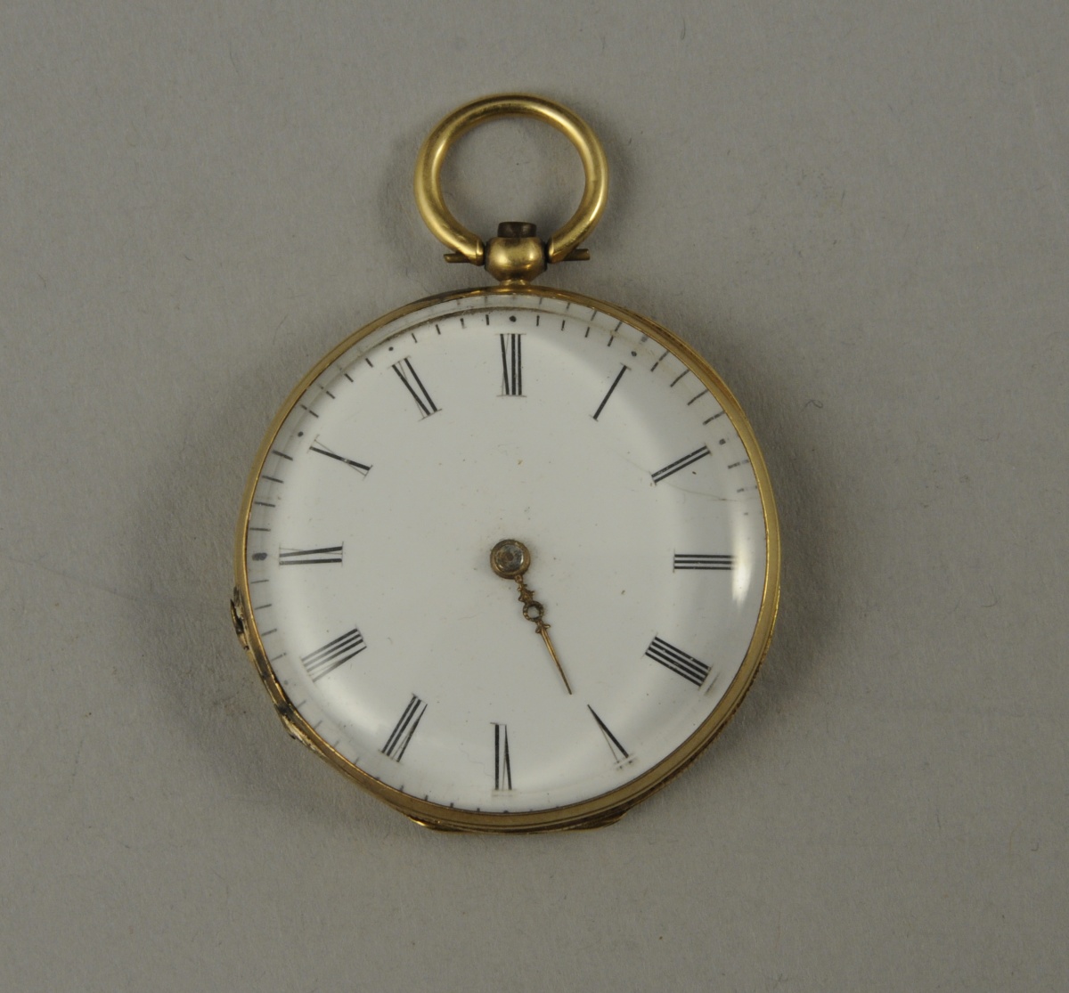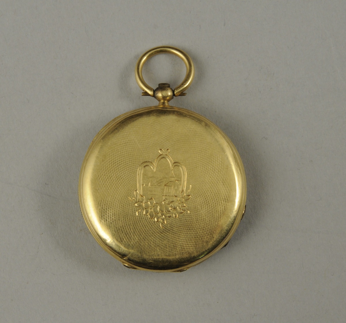 MONTRE DE GOUSSET en or. Cadran émaillé indiquant les heures en chiffres arabes. Boîtier en amati avec écusson floral et église. Numéroté "1005".