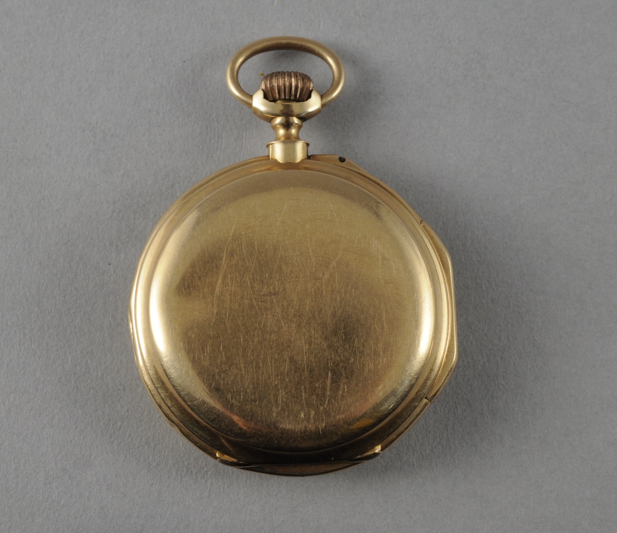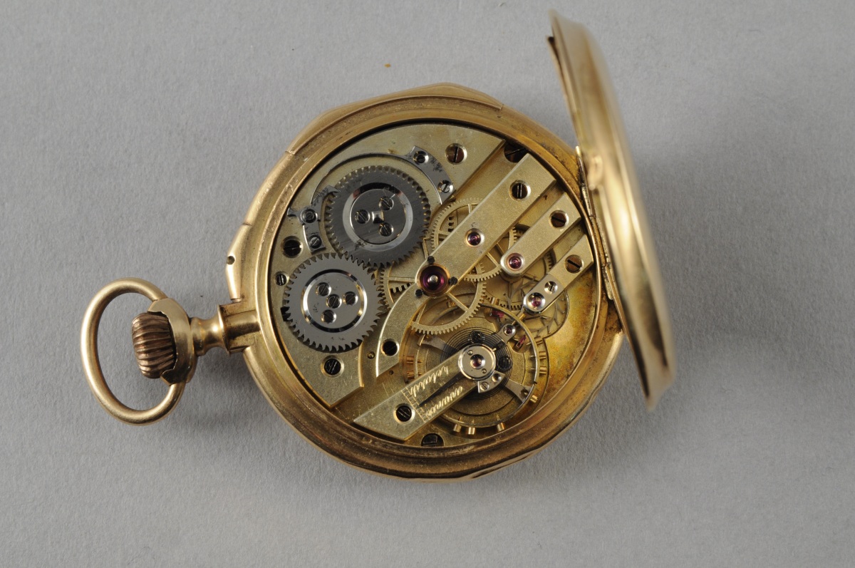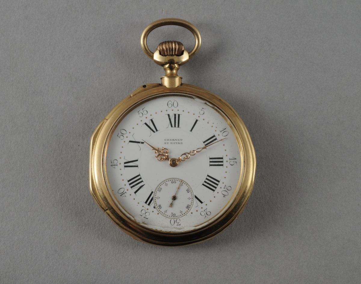 MONTRE DE GOUSSET en or jaune à remontoir au pendant. Double cadran émaillé blanc indiquant les heures en chiffres romains, les minutes en chiffres arabes et les secondes. Échappement à ancre. Signée "Charvet au Havre".