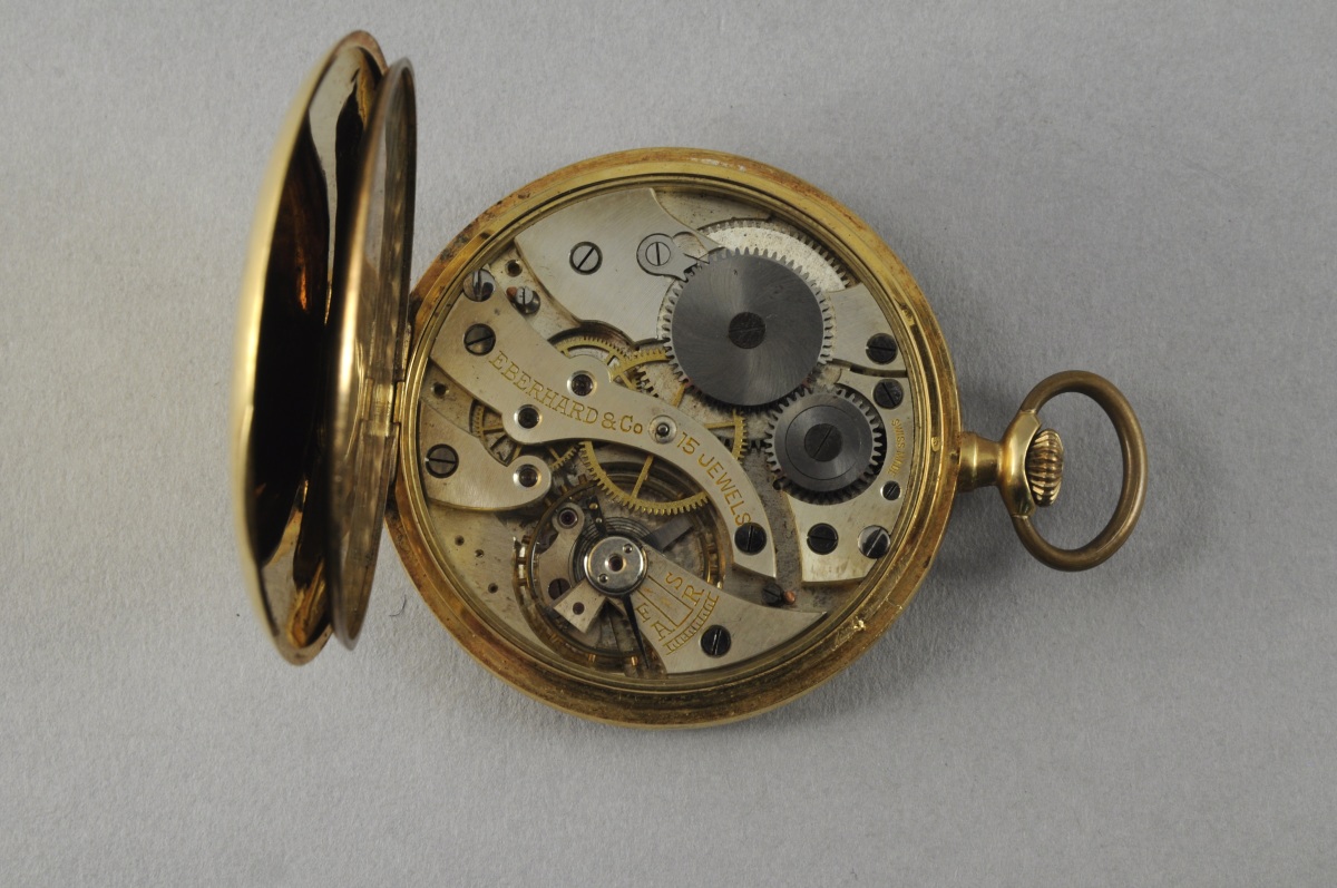 MONTRE DE GOUSSET en or jaune à remontoir au pendant. Cadran double en métal doré indiquant les heures en chiffres arabes et les secondes. Signé "EBERHARD & Co / Chaux-de-Fonds". Le cache-poussière en métal doré signé. Mouvement à échappement à ancre signé et gravé "15 jewels". Début du XXème.