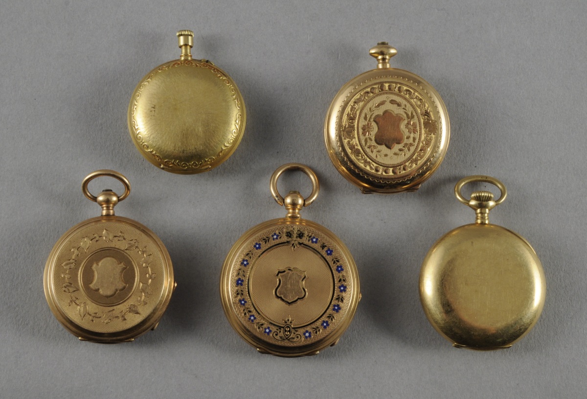 LOT DE 5 MONTRES DE COL en or, à clef ou à remontoir au pendant. L'une de la marque ZÉNITH dotée d'un mécanisme à échappement à ancre, une autre dont le dos est émaillé bleu et noir de guirlandes fleuries.