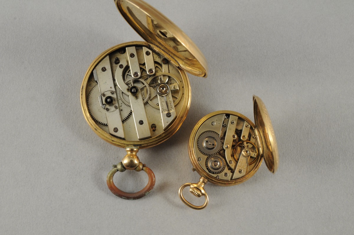 -MONTRE DE GOUSSET à clef. Le cadran émaillé blanc indiquant les heures en chiffres romains et les minutes en chiffres arabes. Le dos du boîtier orné d'un écusson dans un encadrements de feuillages stylisés sur fond guilloché.