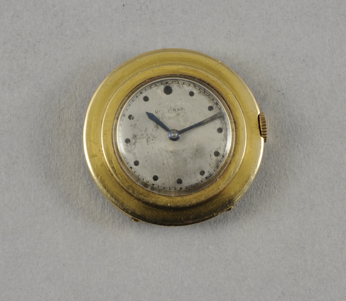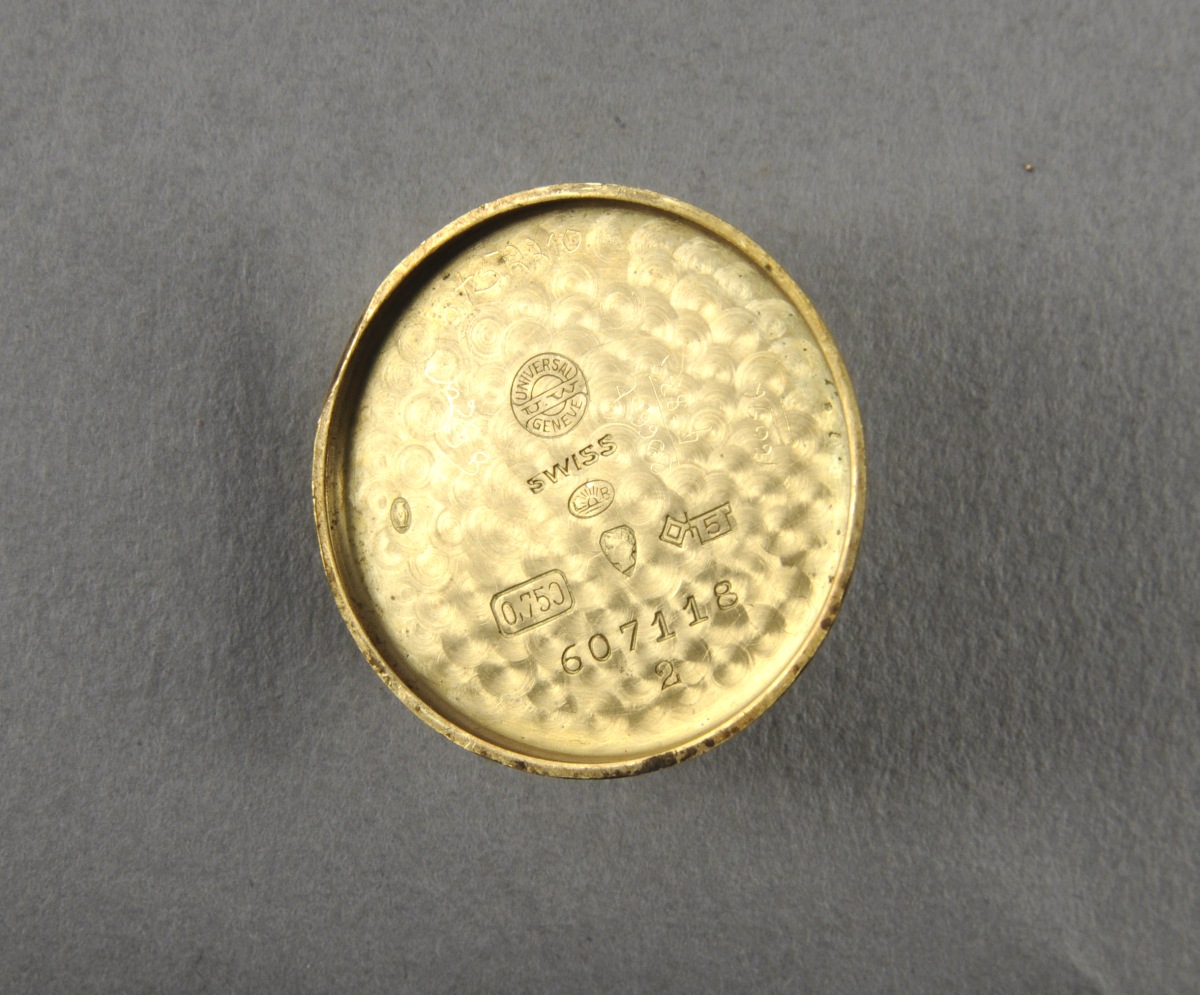 UNIVERSAL GENÈVE. MONTRE-BRACELET de forme ronde en or jaune. Cadran métallique indiquant les heures et les minutes par des cercles et des bâtonnets noirs. Signé. Aiguilles en acier bleui. Mouvement signé.
