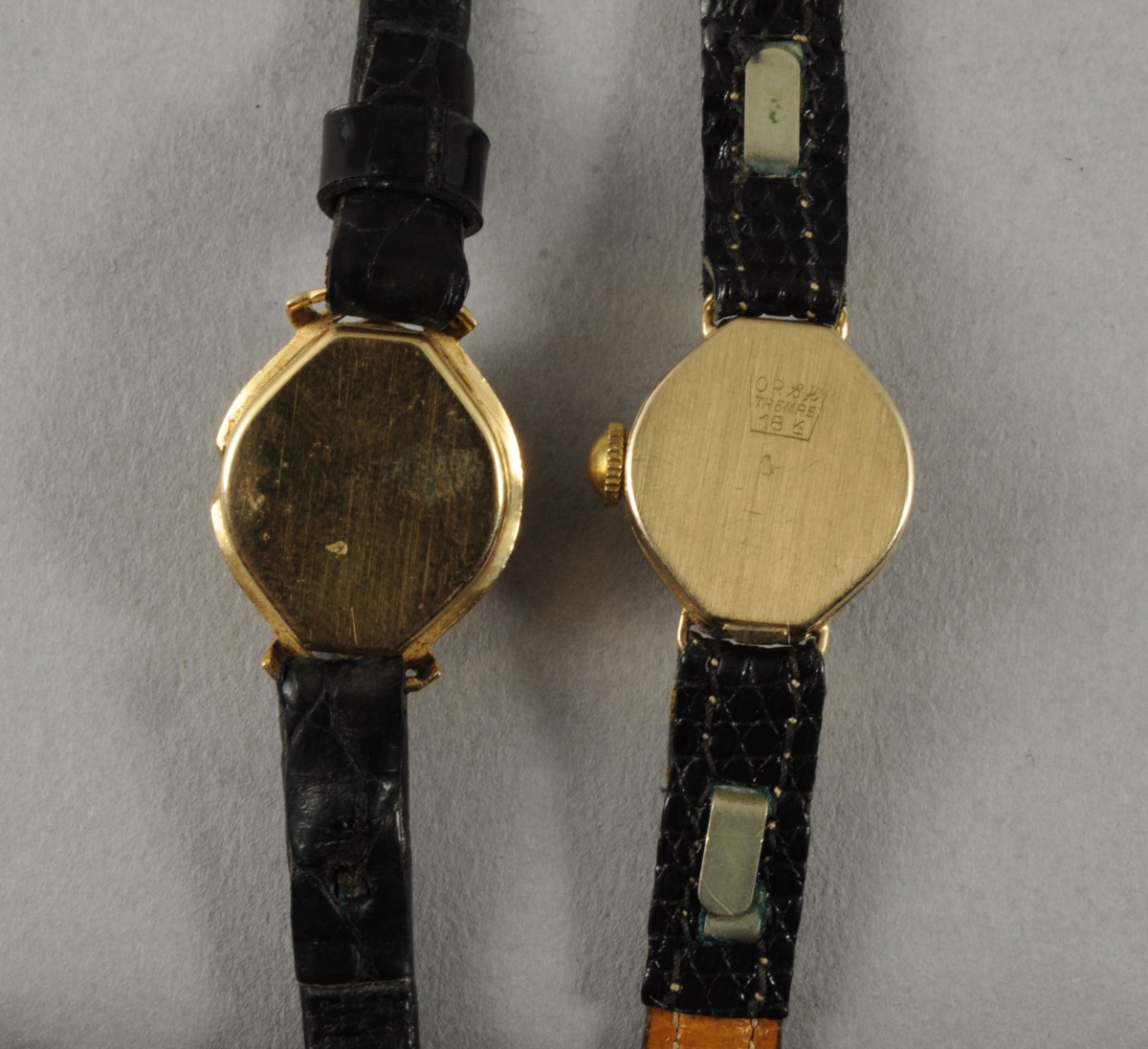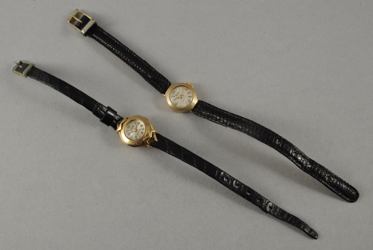 LOT DE 2 MONTRES-BRACELETS de dame en or. Bracelets en cuir noir.