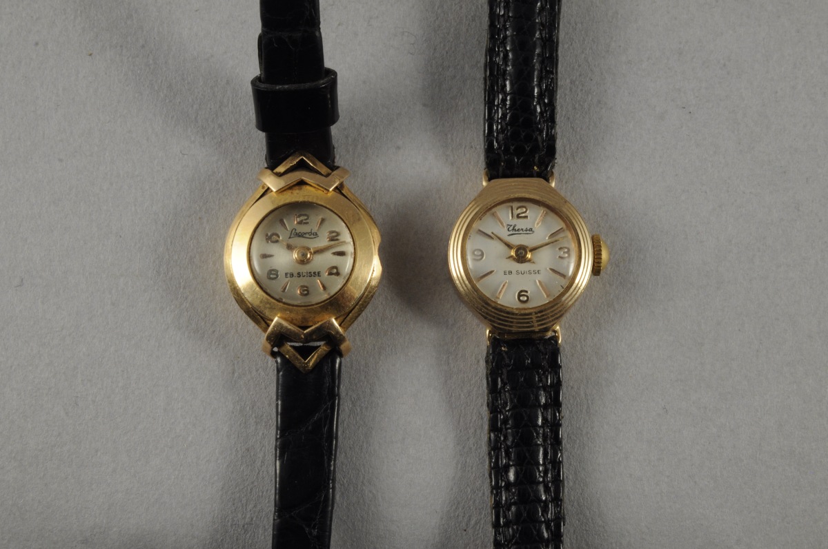 -La première de forme ronde. Cadran indiquant les heures en chiffres arabes et index bâtonnets. Signée "Thersa / EB Suisse". Diam. 1,5 cm. Poids brut: 8 g.