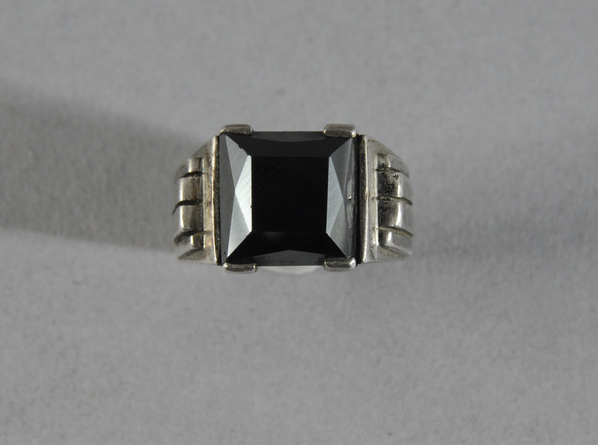 BAGUE en argent sertie d'une pierre noire de taille carrée. Style Art Déco. Poinçon au crabe, après 1938. Poids brut: 9,9 g.