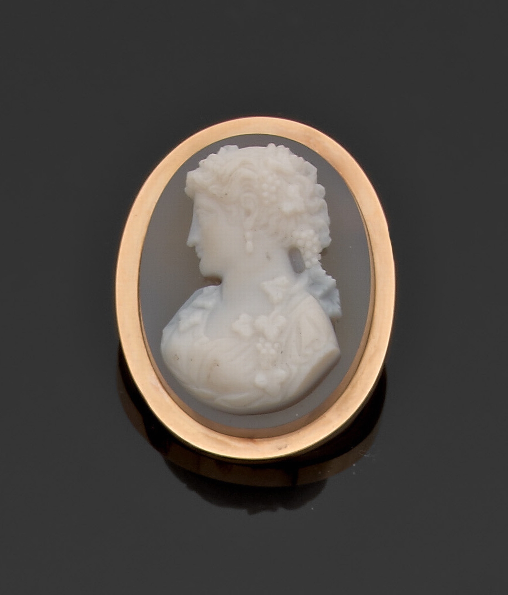 BROCHE ovale en or jaune ornée d'un camée agate représentant...