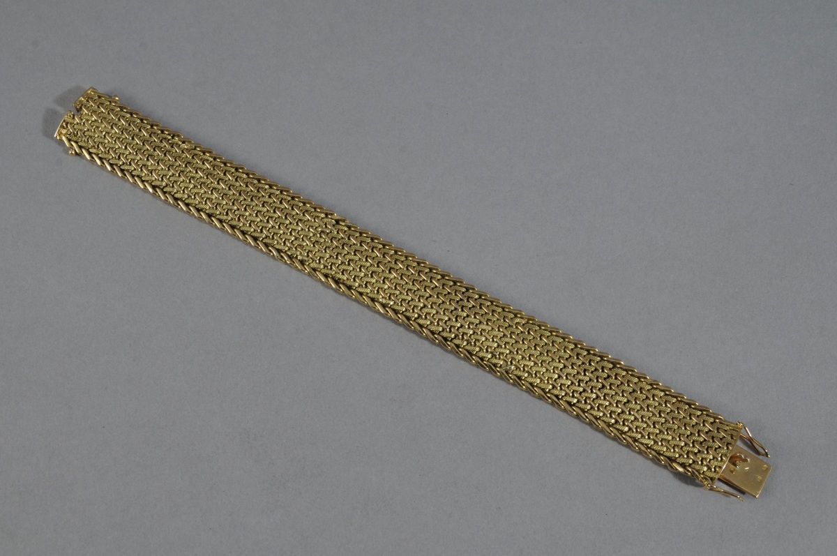BRACELET en or de deux tons, maille articulée à ruban. Long. 19 cm, Poids: 31,7 g. (restauration?)