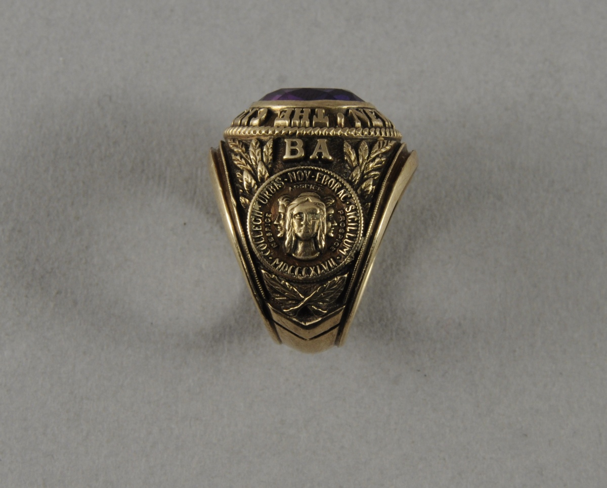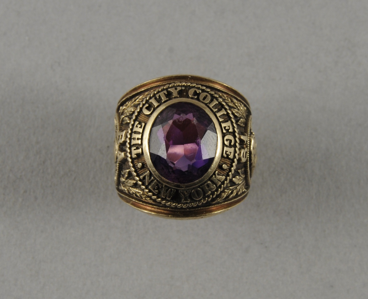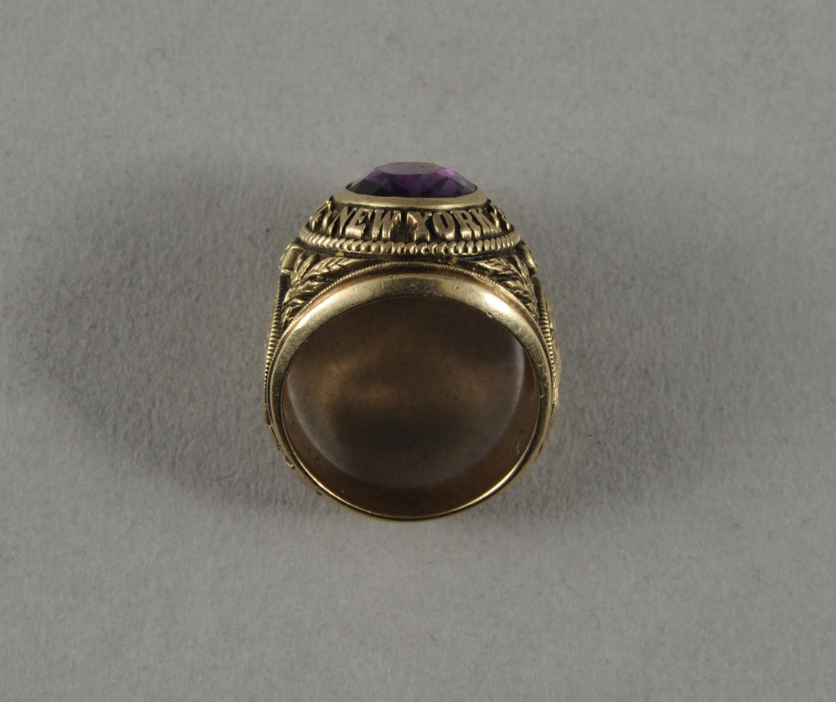 BAGUE CHEVALIÈRE dite UNIVERSITAIRE en or sertie d'une amétyste. L'anneau porte l'inscription "The City College of New York". Il est