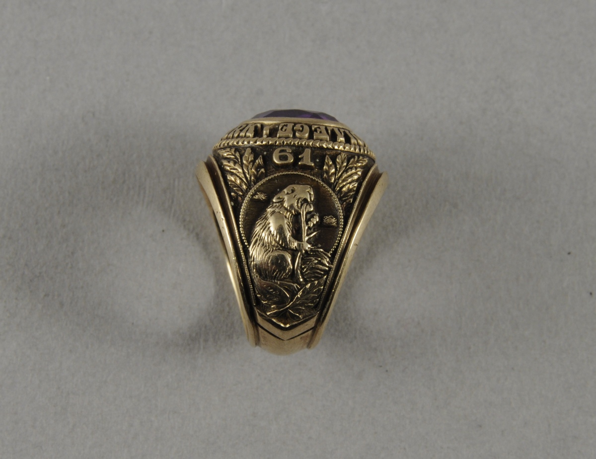 ciselé de l'emblème de l'université, d'un castor et de feuillages. Il porte les lettres "BA" et est daté 61. Poids brut: 15,5 g.