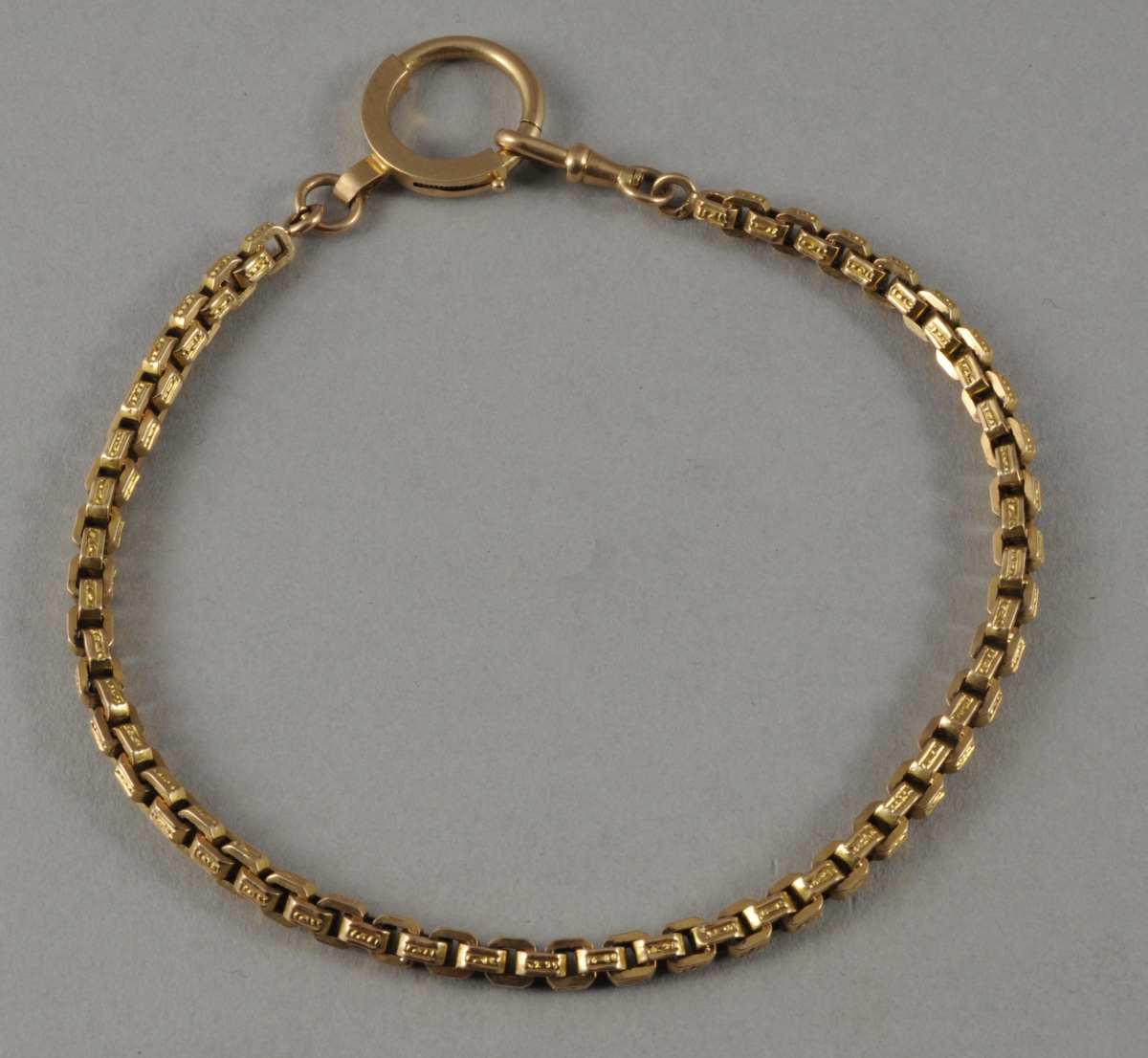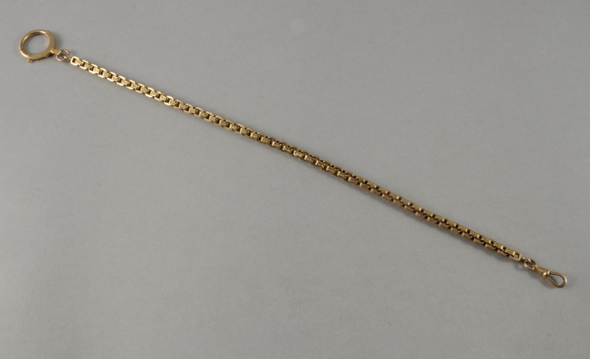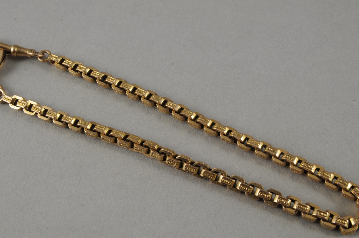 CHAÎNE GILETIÈRE EN OR de deux tons. Maille vénitienne ornée de guillochis. Long. 31 cm. Poids: 16,3 g.