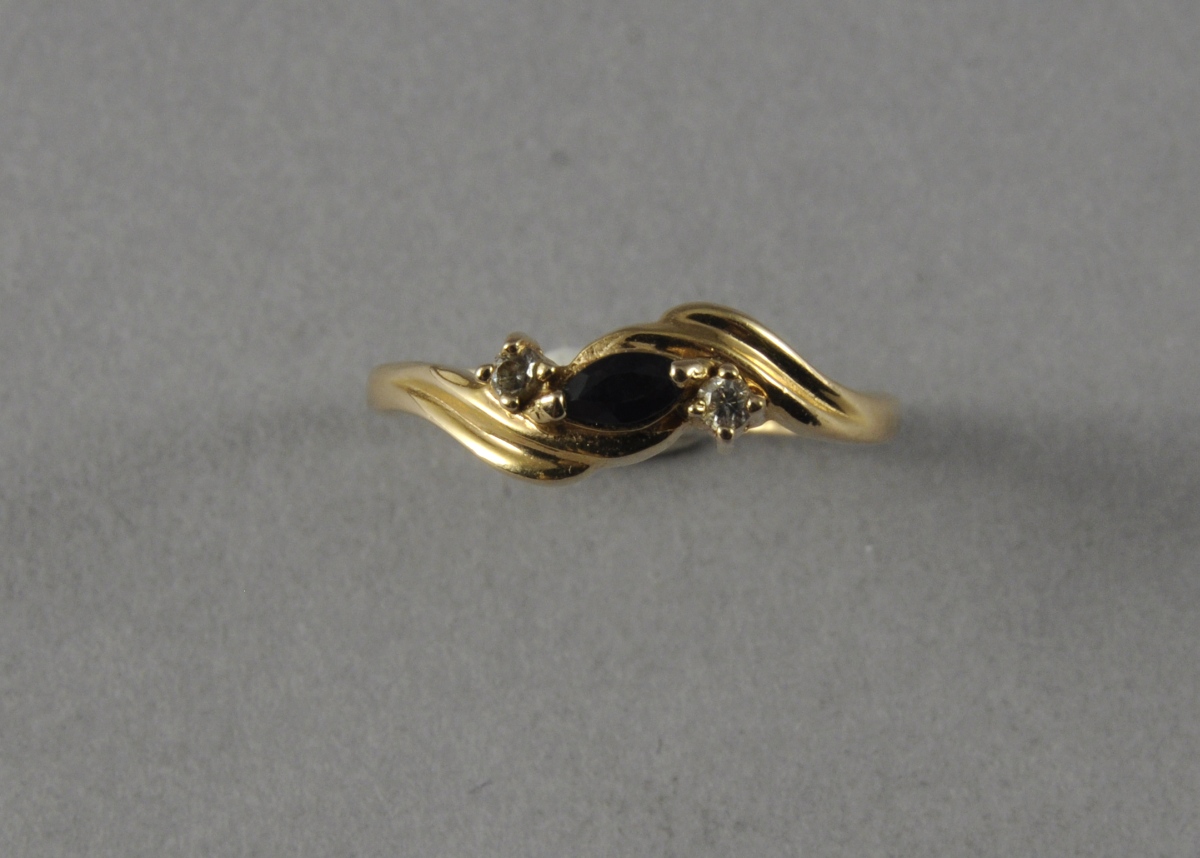 BAGUE en or jaune sertie d'un saphir taille navette accosté de deux petits brilliants. Poinçon illisible. Poids brut: 2,1 g.