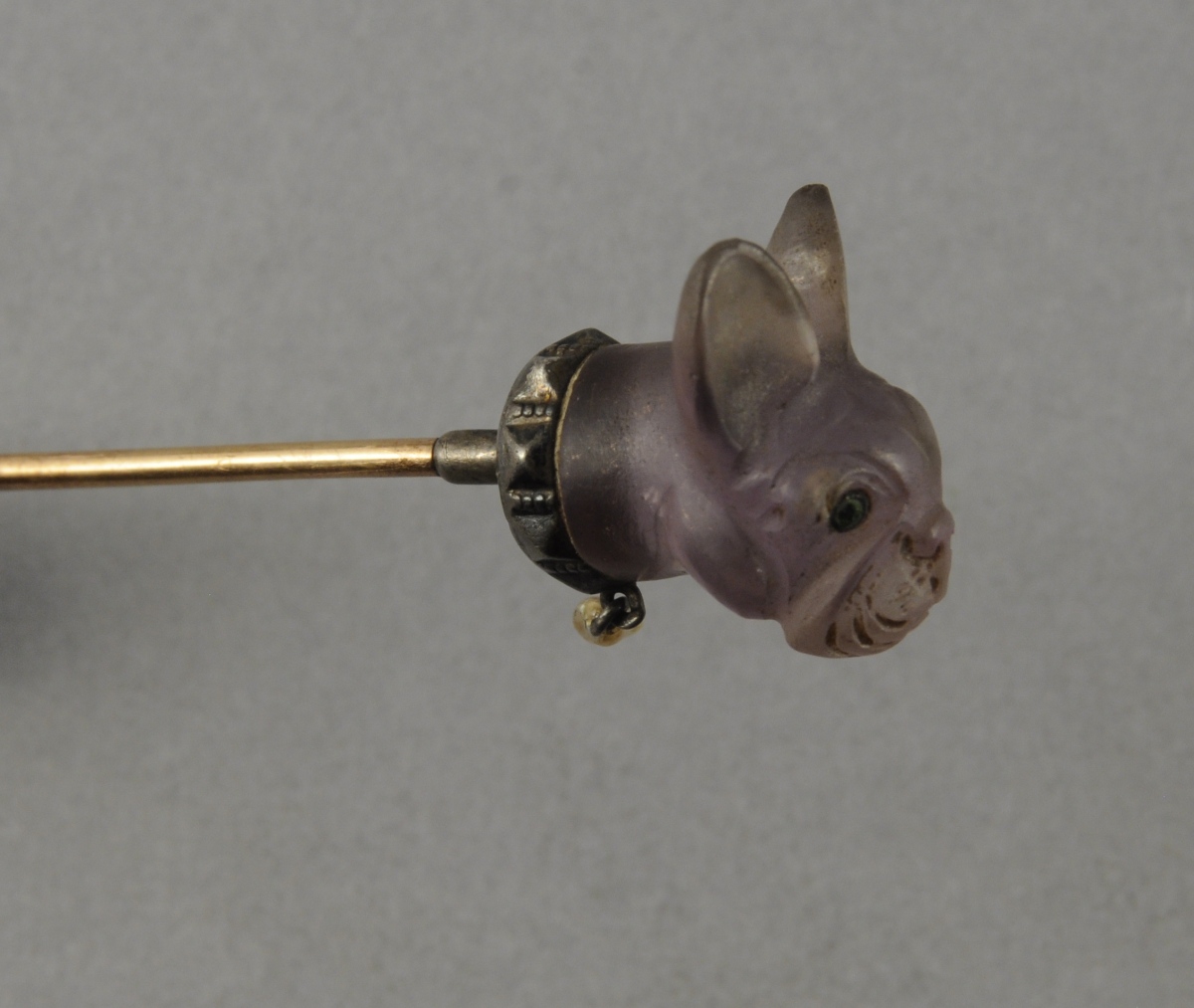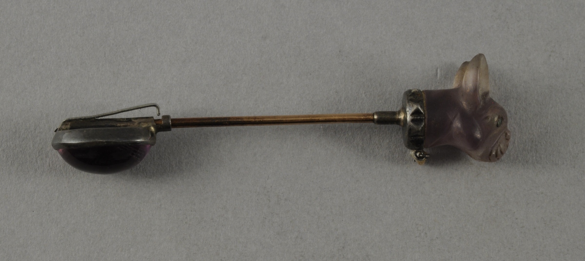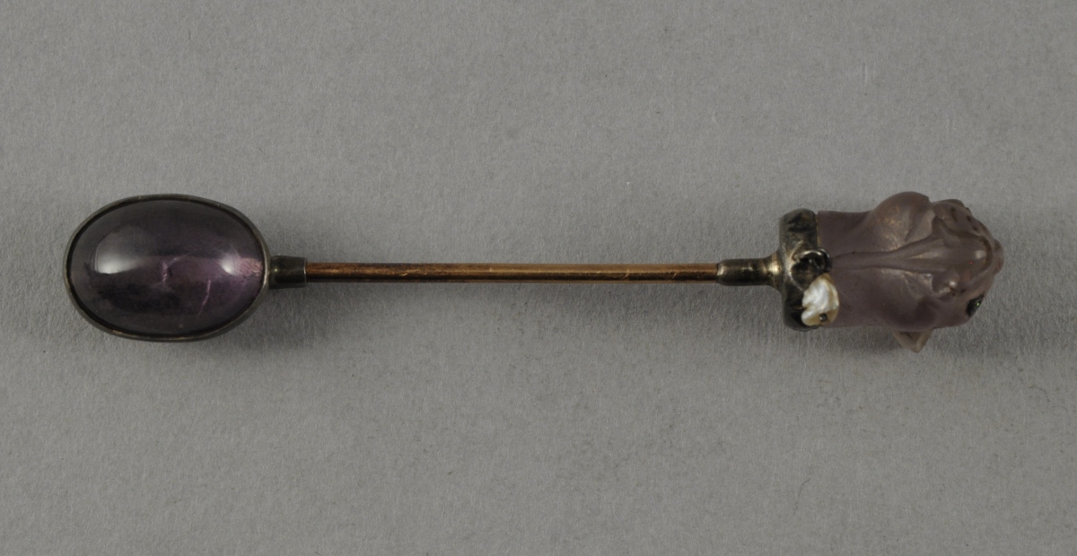 ÉPINGLE de CRAVATE en or et argent serti de deux améthystes. L'une taillée en forme de tête de bouledogue, l'autre en cabochon. Le collier du bouledogue en pointes de diamant orné d'une petite perle baroque. Travail probablement anglais, XXème. Long. 8 cm. (infimes égrisures)