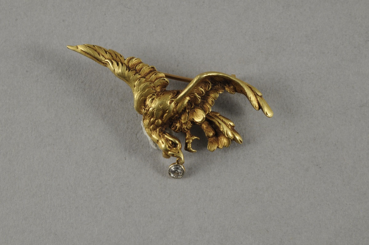 BROCHE en or jaune représentant un aigle tenant dans son bec un brillant. Poids brut: 8,4 g.