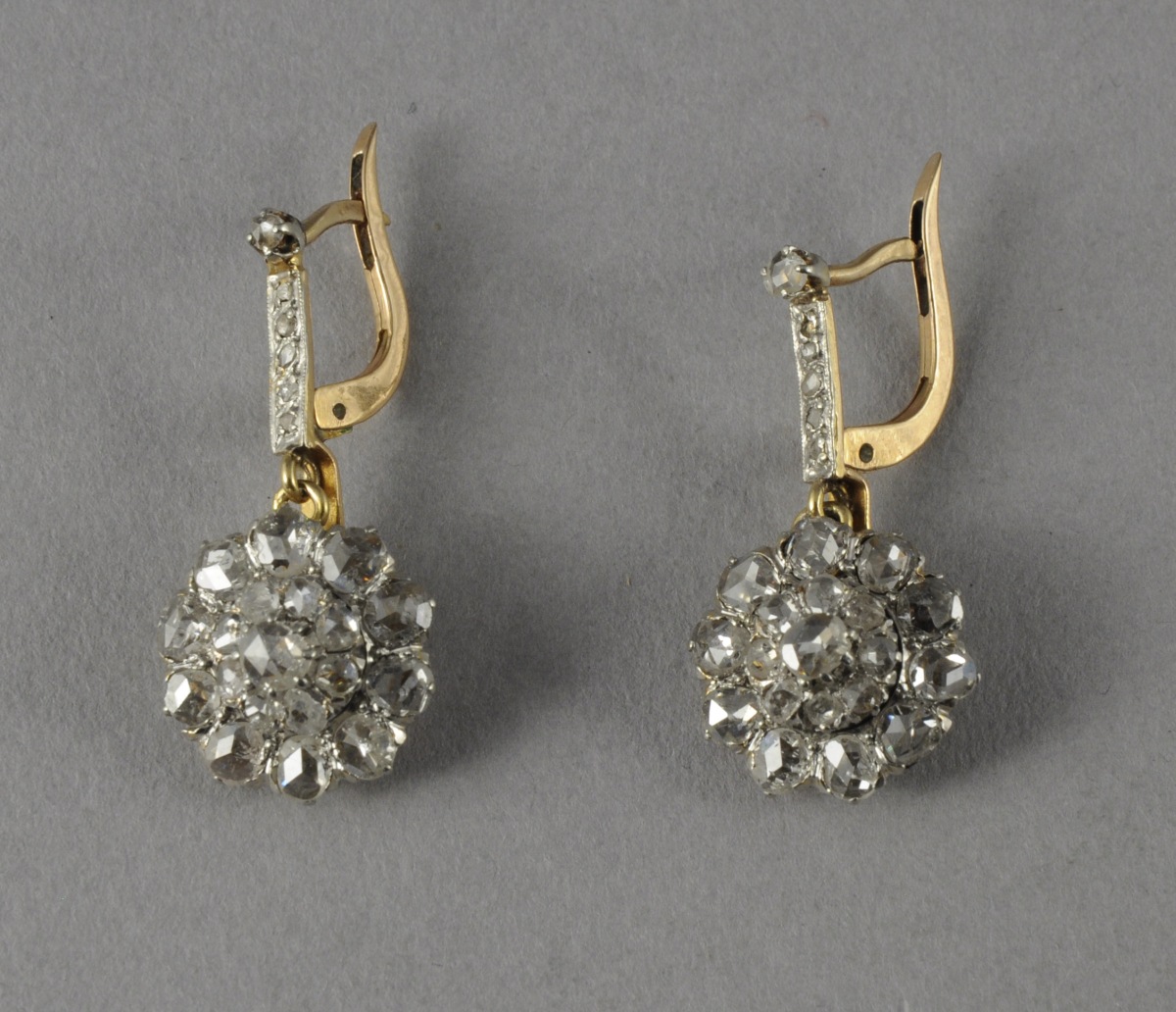PAIRE de PENDANTS D'OREILLES de forme fleur articulés en or, pavés de diamants. L'attache pavée de brillants. Poids brut: 7,1 g.