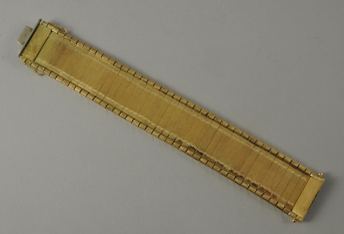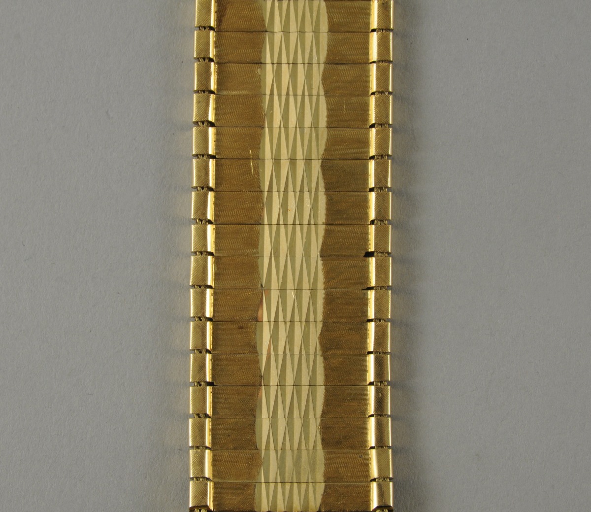 BRACELET de forme rectangulaire à maille souple en or. Il est orné d'une frise de losanges sur fond amati. Marqué "LPC" et "N°127-?". Fermoir en or blanc probablement rapporté.