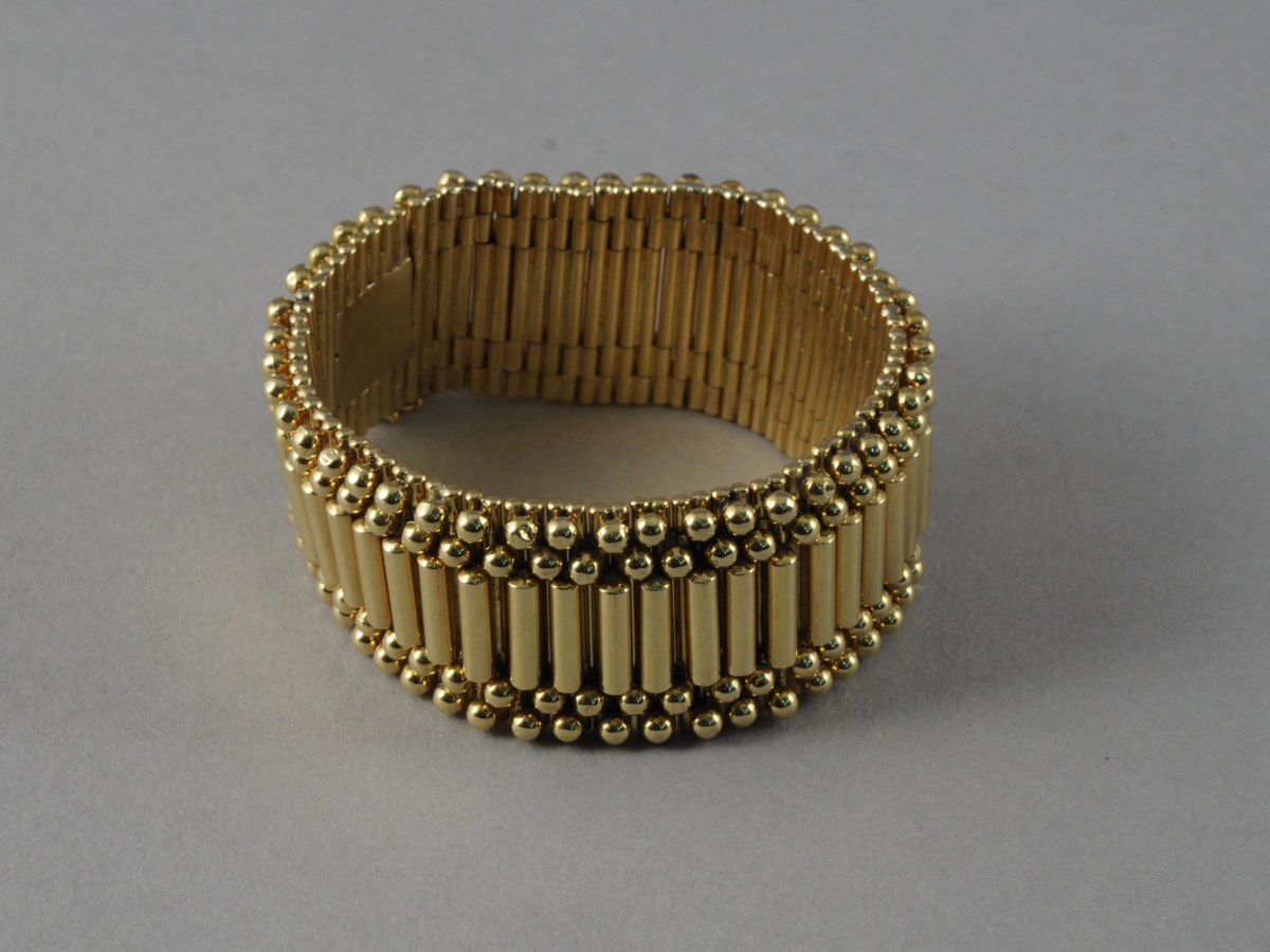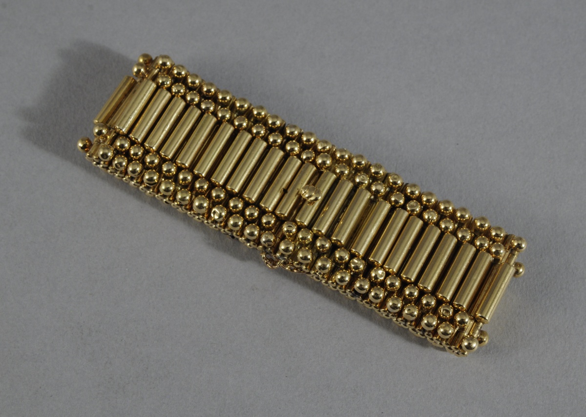 BRACELET ARTICULÉ en or jaune à longues mailles bordées de deux rangs de petites boules. Poinçon tête d'aigle. Travail français vers 1930 - 1940.