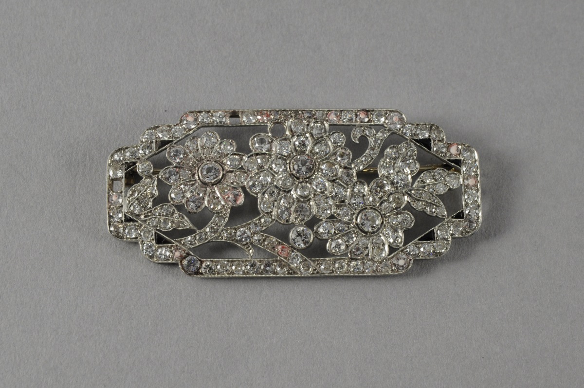 BROCHE rectangulaire en platine ajouré à décor de fleurs, entièrement pavée de pierres de synthèse blanches, de diamants ronds et d'onyx de forme triangulaire.