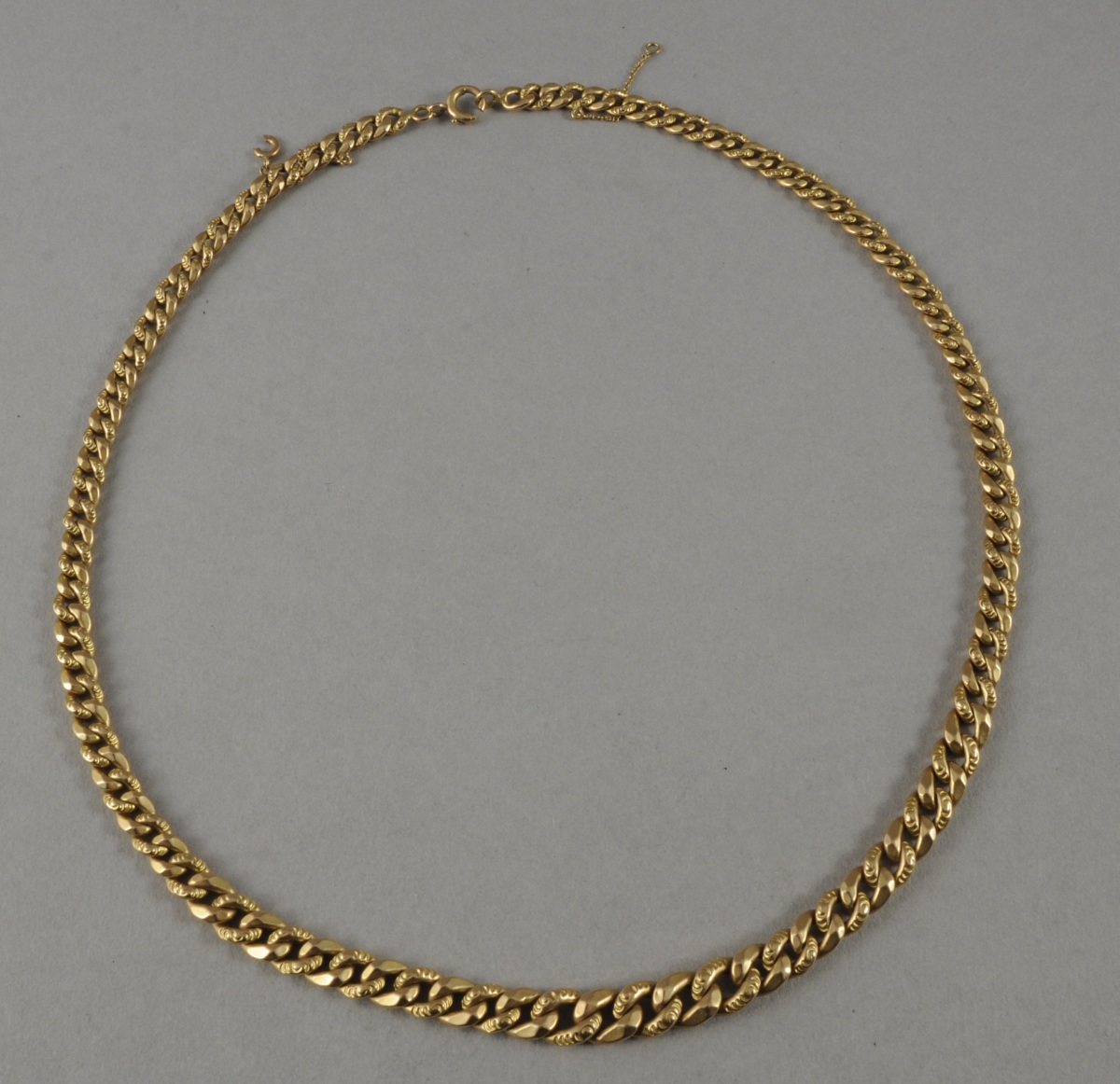 COLLIER souple en or jaune, maille gourmette en chute. Long. 47 cm. Poids: 17,6 g. (fermoir de sécurité accidenté)