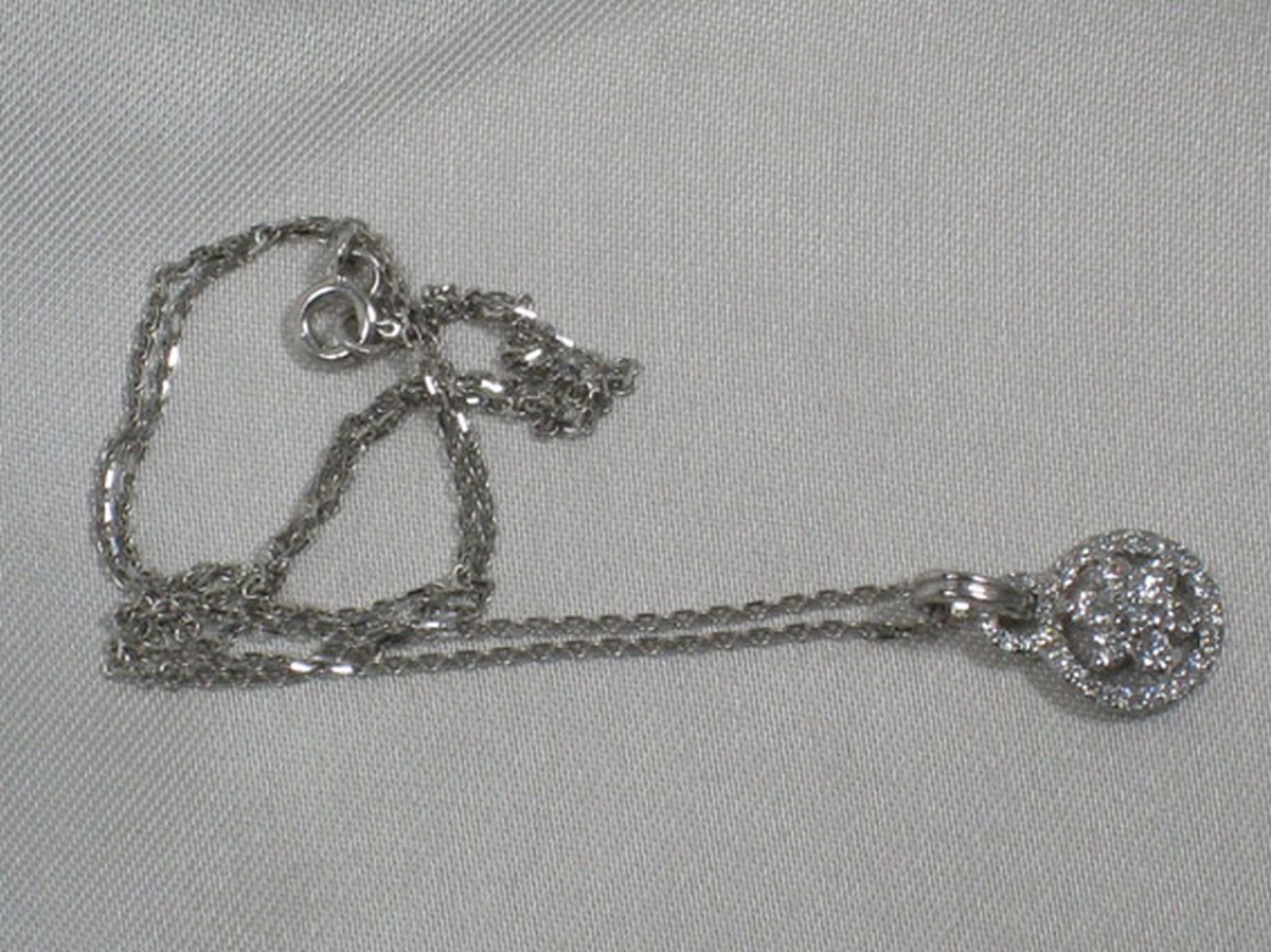 PENDENTIF de forme ronde orné d'un pavage ajouré de sept diamants blancs taille moderne dans un entourage de 27 diamants blancs taille moderne de 0,6 carat environ. Avec une chaîne maille forçat en or blanc dotée d'un fermoir avec anneau ressort.