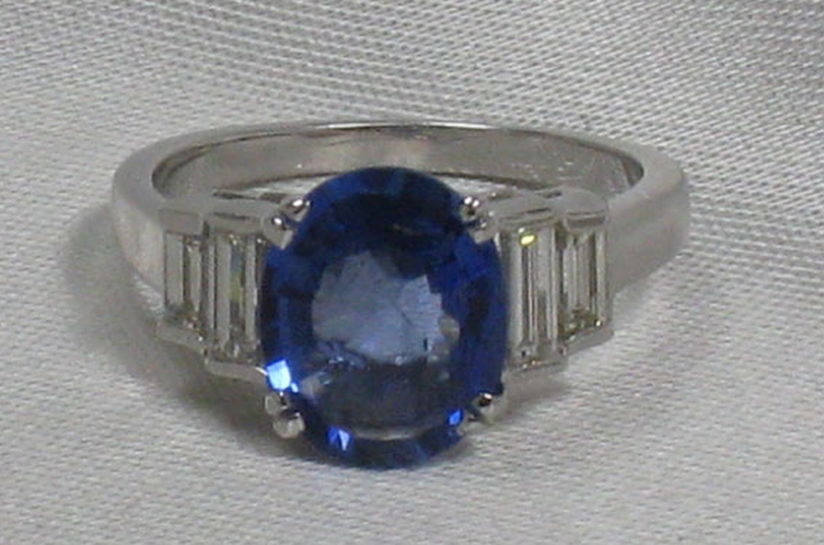 BAGUE en or blanc ornée d'un saphir de Ceylan taille ovale de 2,55 carats et agrémentée de quatre diamants blancs taille baguette de 0,55 carat.