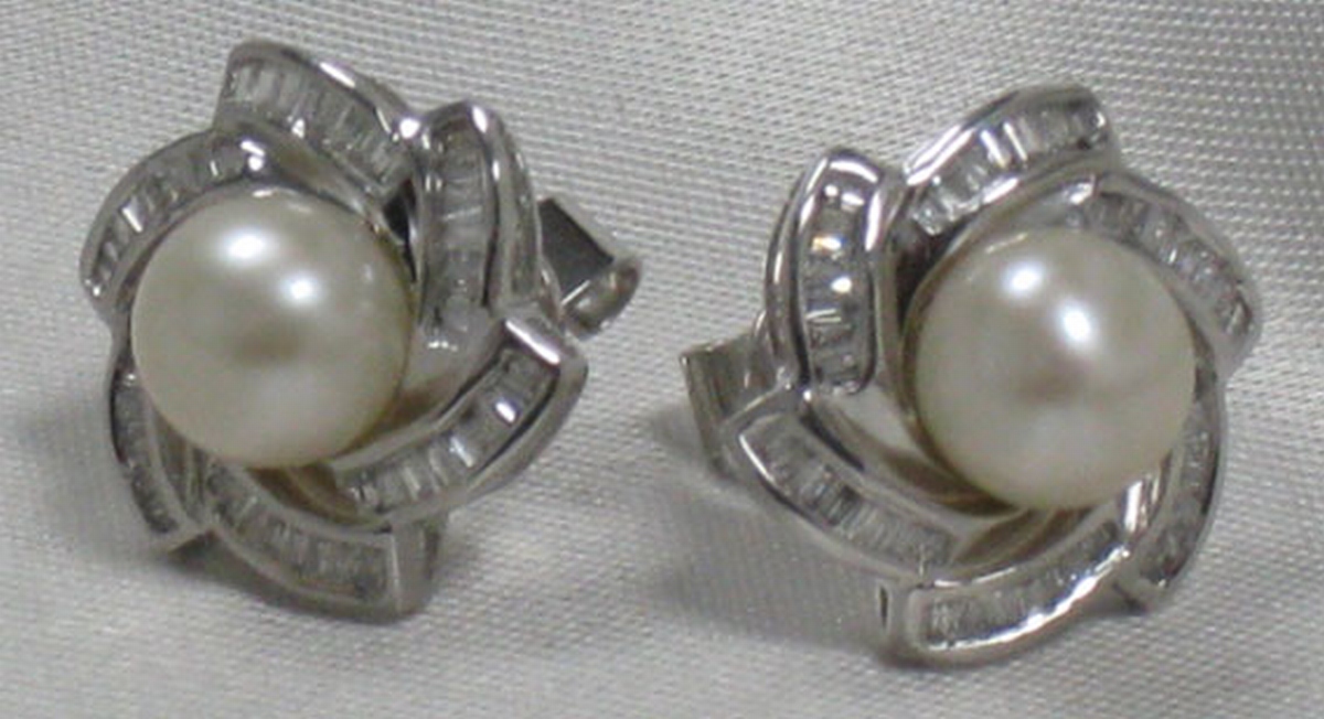 PAIRE DE BOUCLES D'OREILLE en or blanc ornée d'une perle de culture de 7,5 mm environ et agrémentée de 44 diamants taille baguette de 0.5 carat environ. Fermoir à poussette belge.