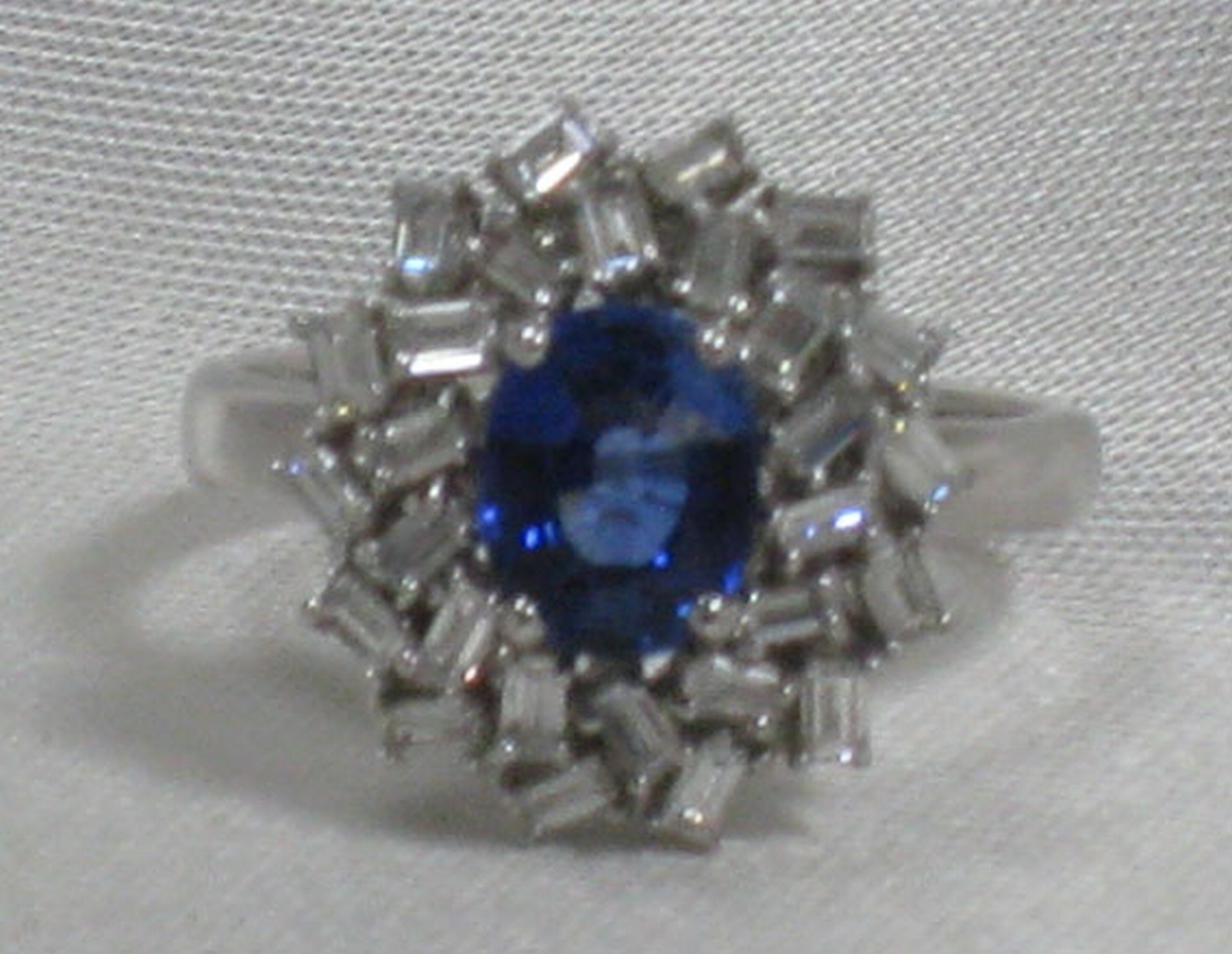 BAGUE en or blanc ornée d'un saphir taille ovale de 1,1 carats et agrémentée d'un double entourage de 28 diamants taille baguette de 0,45 carat environ.