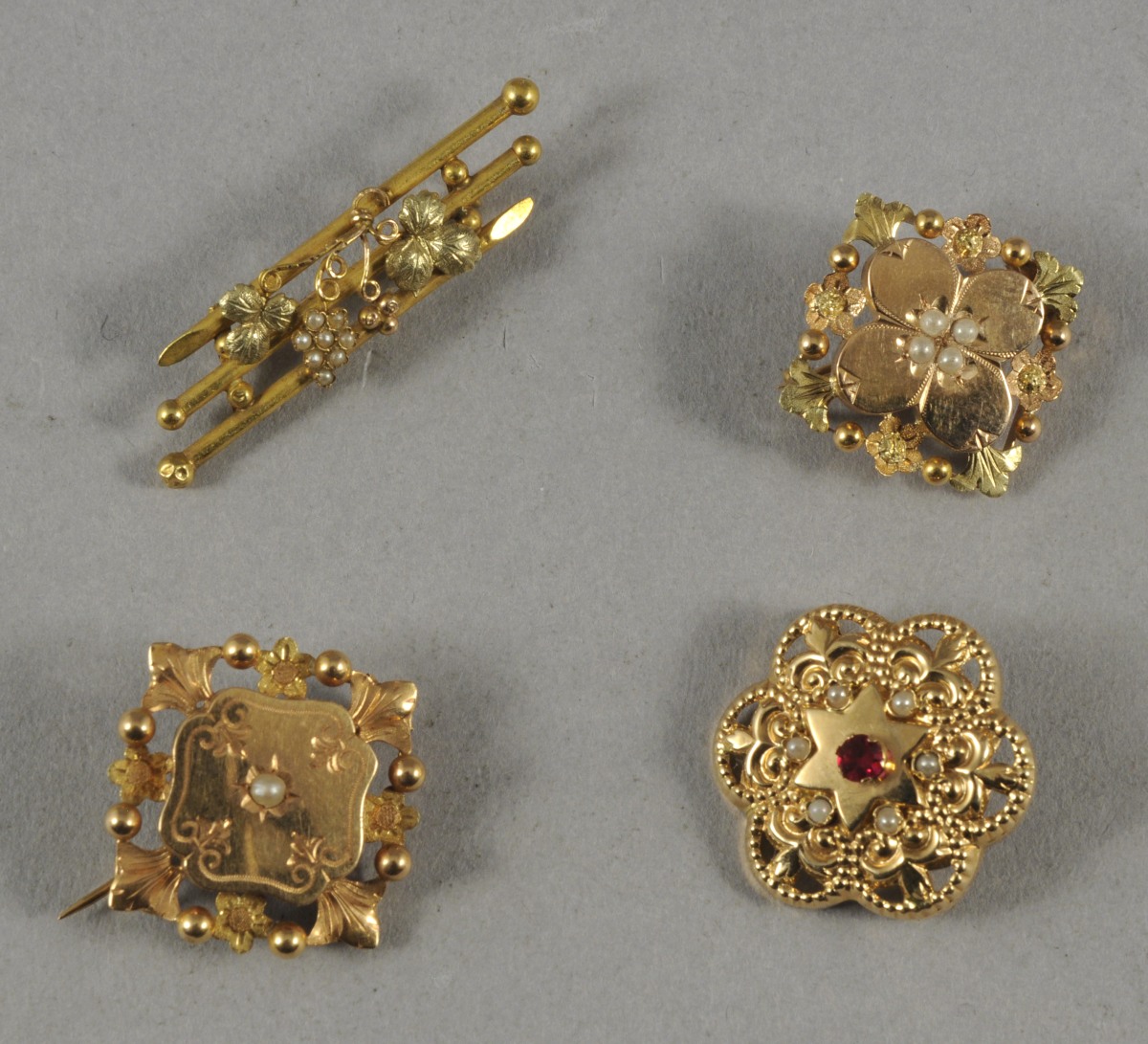 LOT DE QUATRE PETITES BROCHES EN OR à décor végétal stylisé. Elles sont serties de demi-perles. Certaines en or deux tons. L'une centrée d'une petite pierre rouge. Poinçon tête d'aigle ou tête de cheval. Fin XIXème, début XXème.