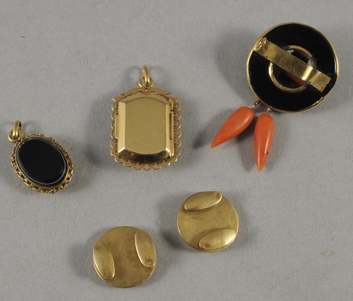 -BROCHE de forme ronde sertie d'un onyx noir ajourée d'un cercle. Elle est centrée d'une demi-bague ciselée de volutes maintenant un cylindre de corail et retenant deux pendeloques de corail. Fin XIXème, début XXème. Diam. 3 cm. Poids brut: 10,9 g.