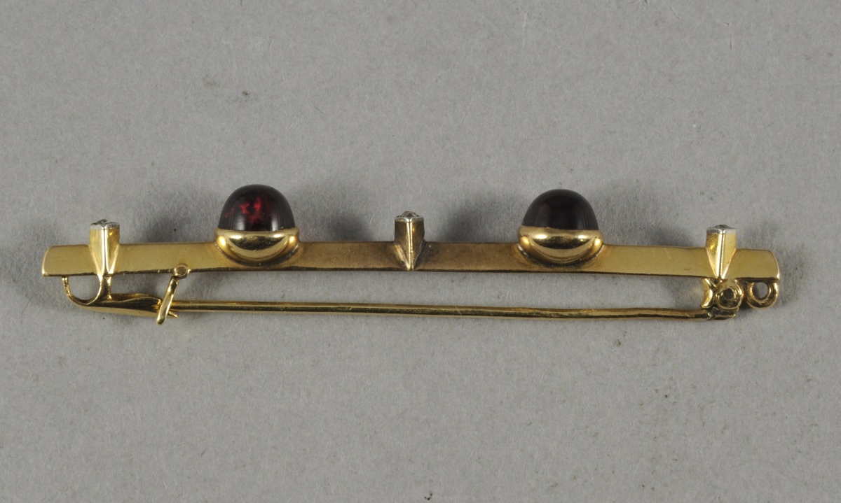 BROCHE en or sertie de deux cabochons ronds de grenat alternants avec trois pierres.