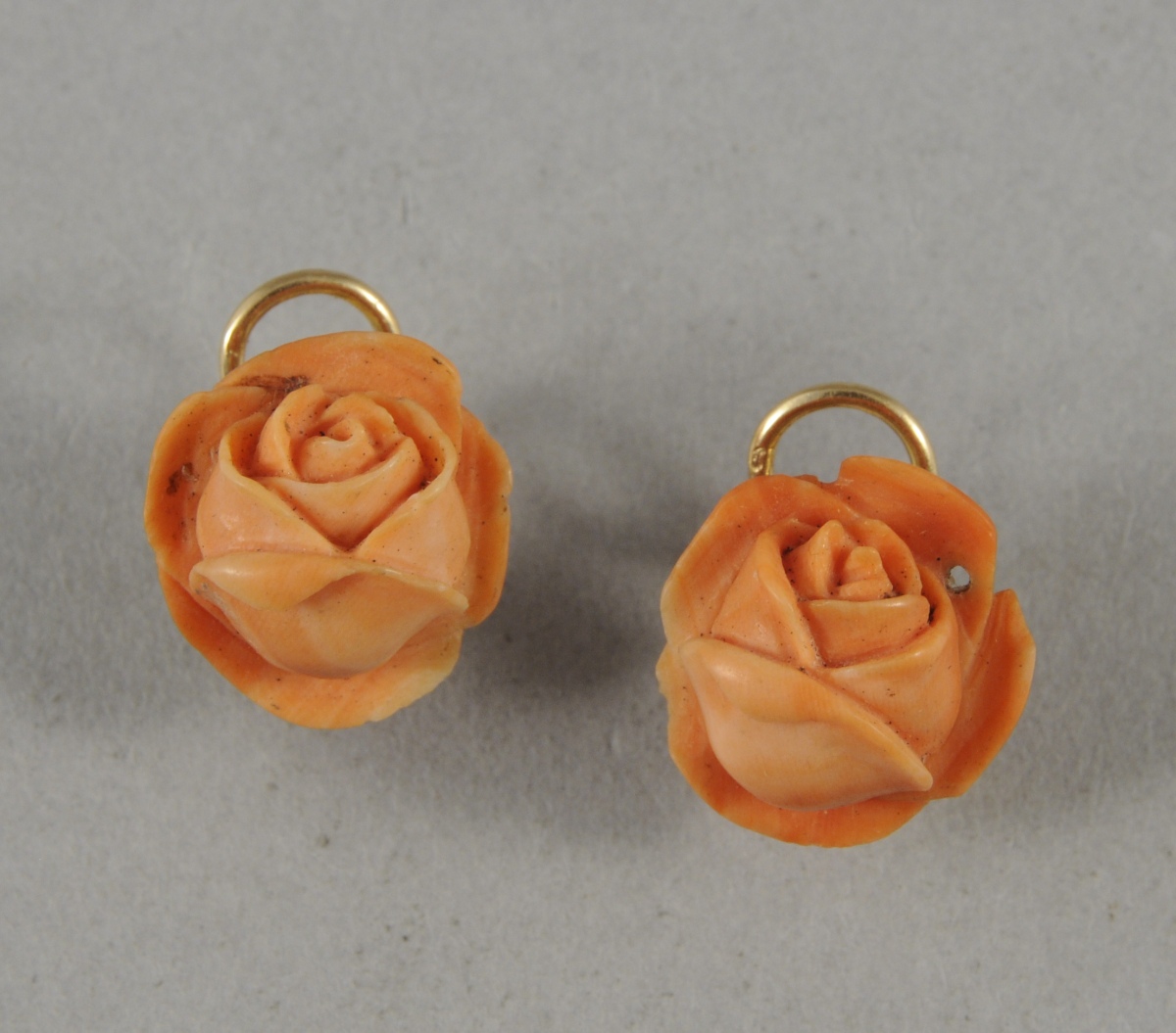 PAIRE DE BOUTONS D'OREILLE en or jaune orné d'une rose en corail sculpté. La monture ornée de godrons. Poinçon tête d'aigle.