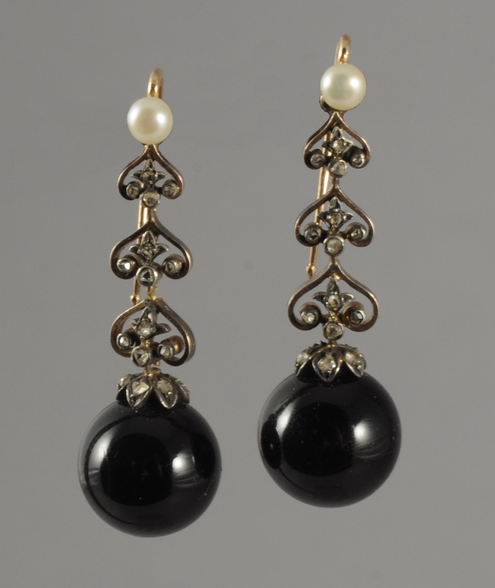 PAIRE DE PENDANTS D'OREILLE en or jaune terminés par une sphère d'onyx noir à culot en forme de fleur serti de trois petites pierres. Elle est retenue par trois éléments figurants un coeur renversé centré d'un fleuron et sertis de quatre petits brillants. Le bouton présente une perle blanche aplatie. Poinçon tête d'aigle. Seconde moitié du XIXème.