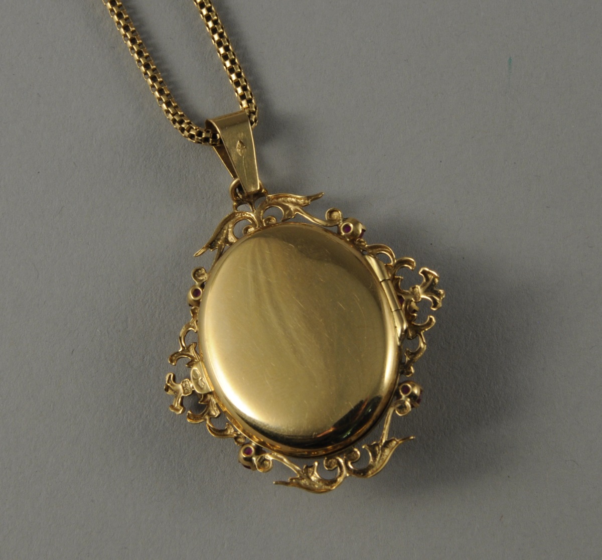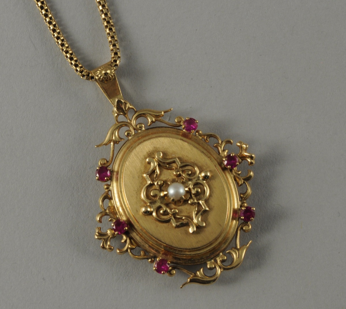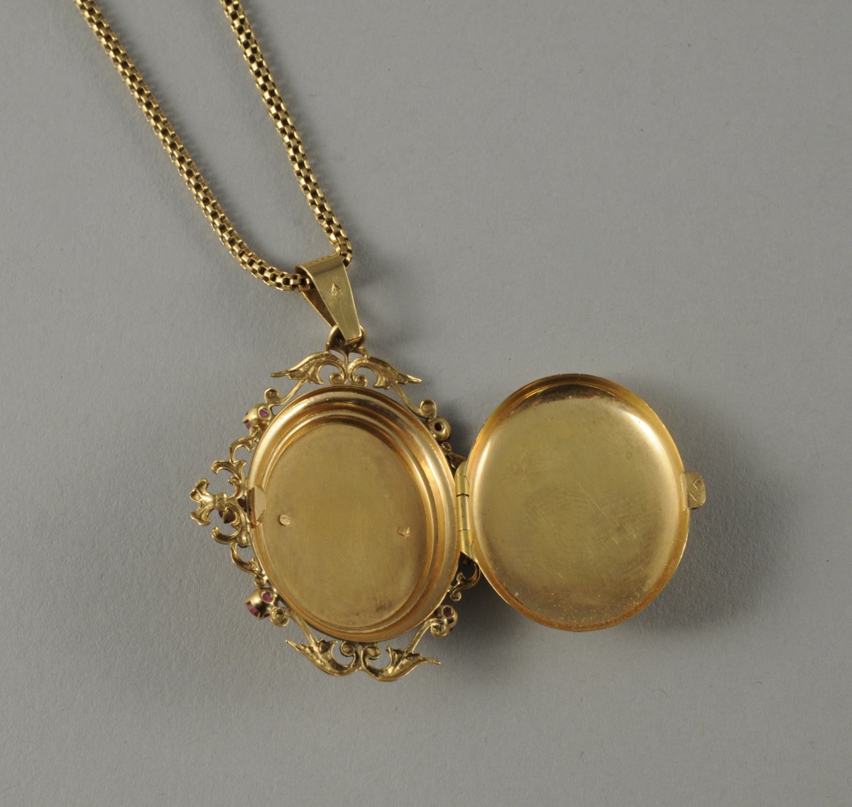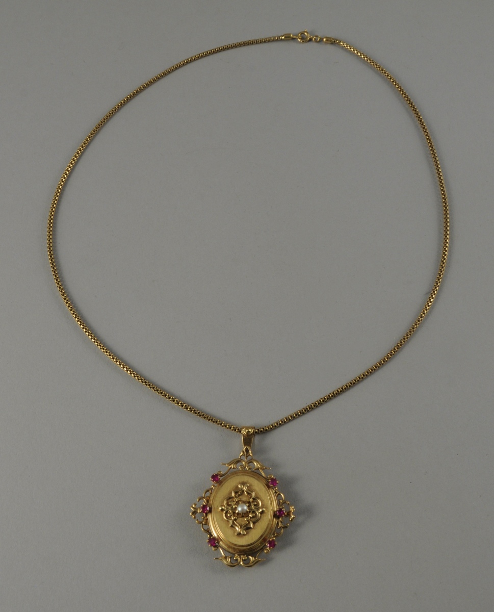 PENDENTIF RELIQUAIRE de forme ovale et une CHAÎNE maille serpent en or. Le pendentif orné de volutes ajourées et serti de part et d'autre de six petites pierres roses. Il est centré d'un motif de ferronerie serti d'une demi perle blanche. Poinçon tête d'aigle.