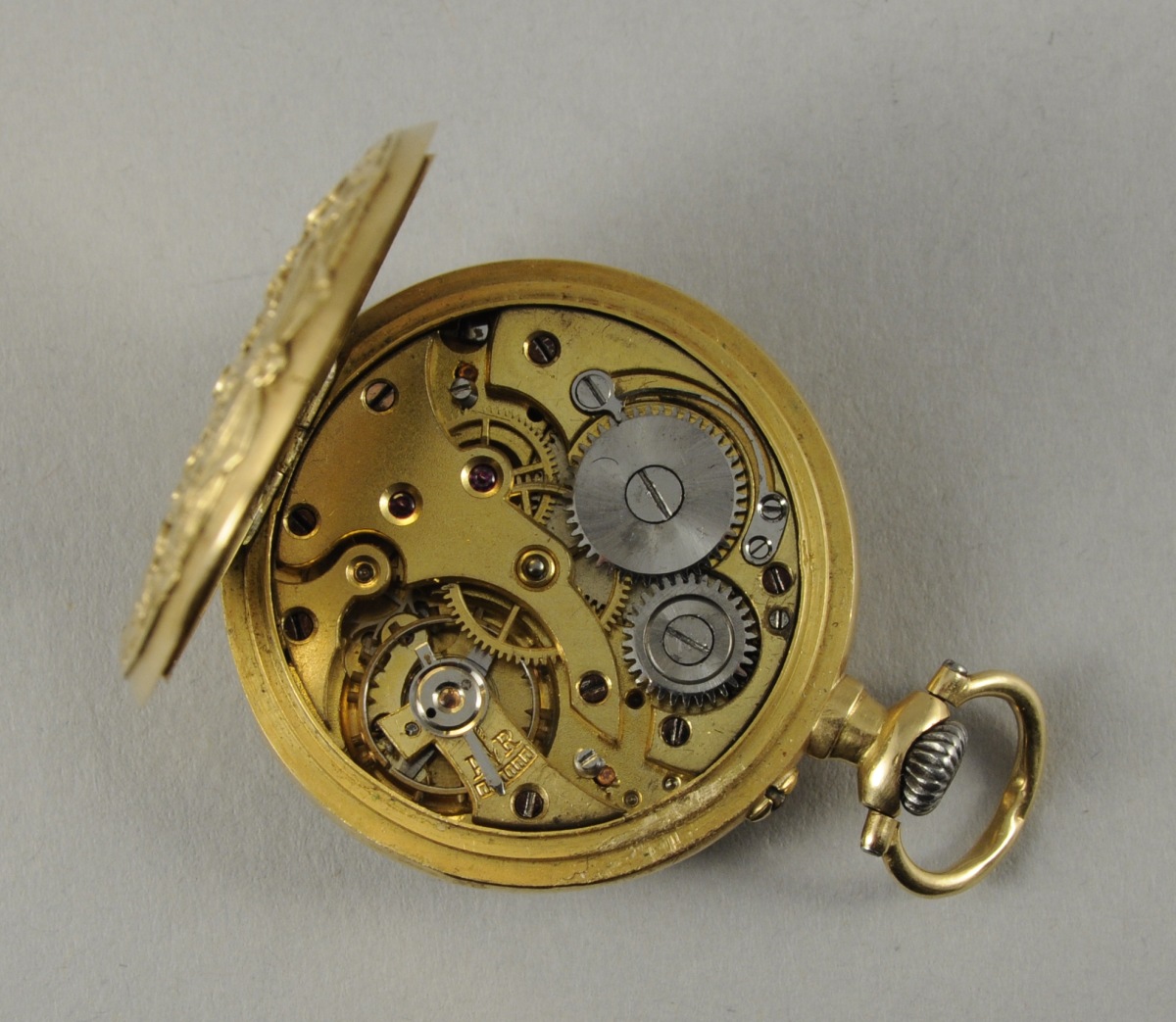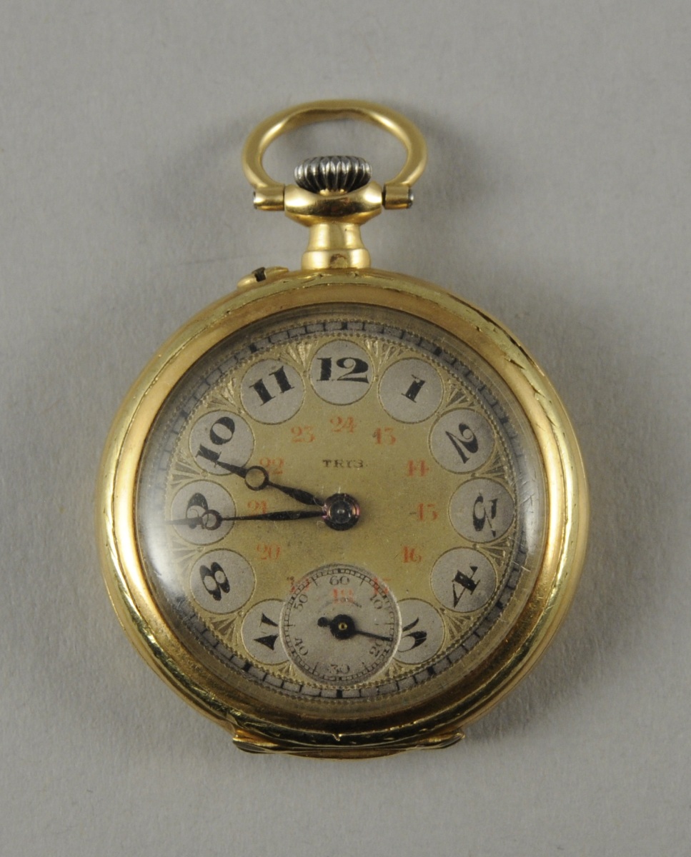 MONTRE DE COL à remontoir au pendant, en or jaune décoré de fleurs.