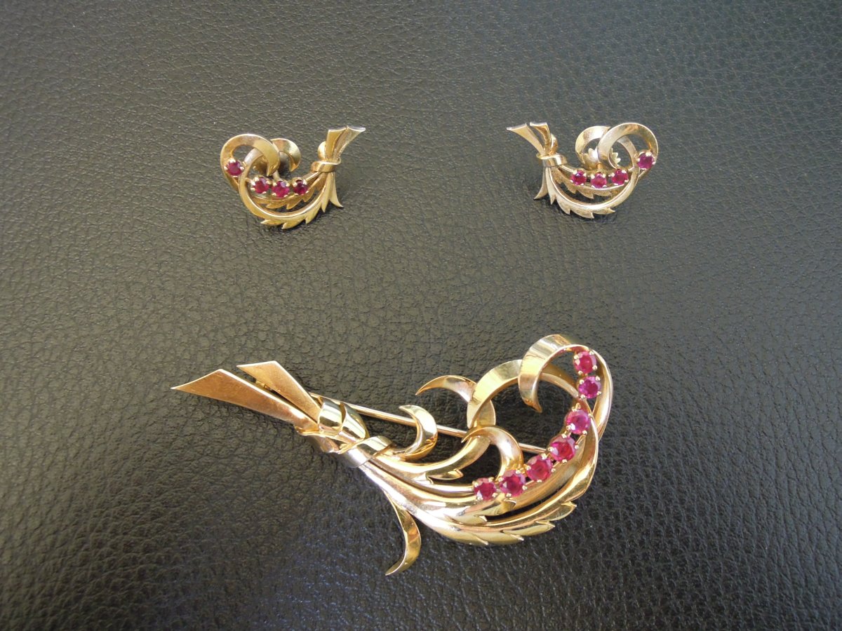 PARURE FEUILLE en or jaune et rubis composée d'une BROCHE...