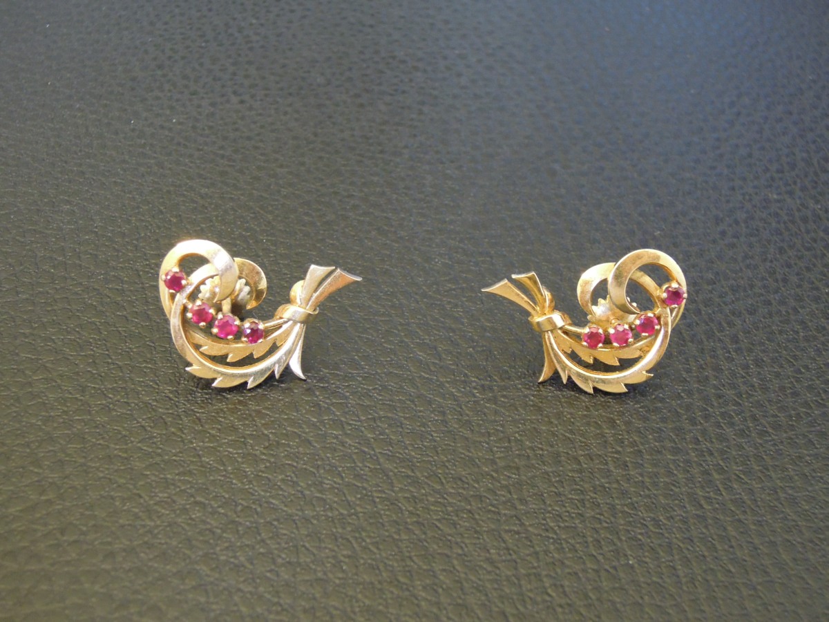 PARURE FEUILLE en or jaune et rubis composée d'une BROCHE en forme de feuille nouée sertie de sept petits rubis de taille brillant et d'une paire de BOUTONS d'OREILLES en forme de feuille nouée sertis chacun de quatre petis rubis.