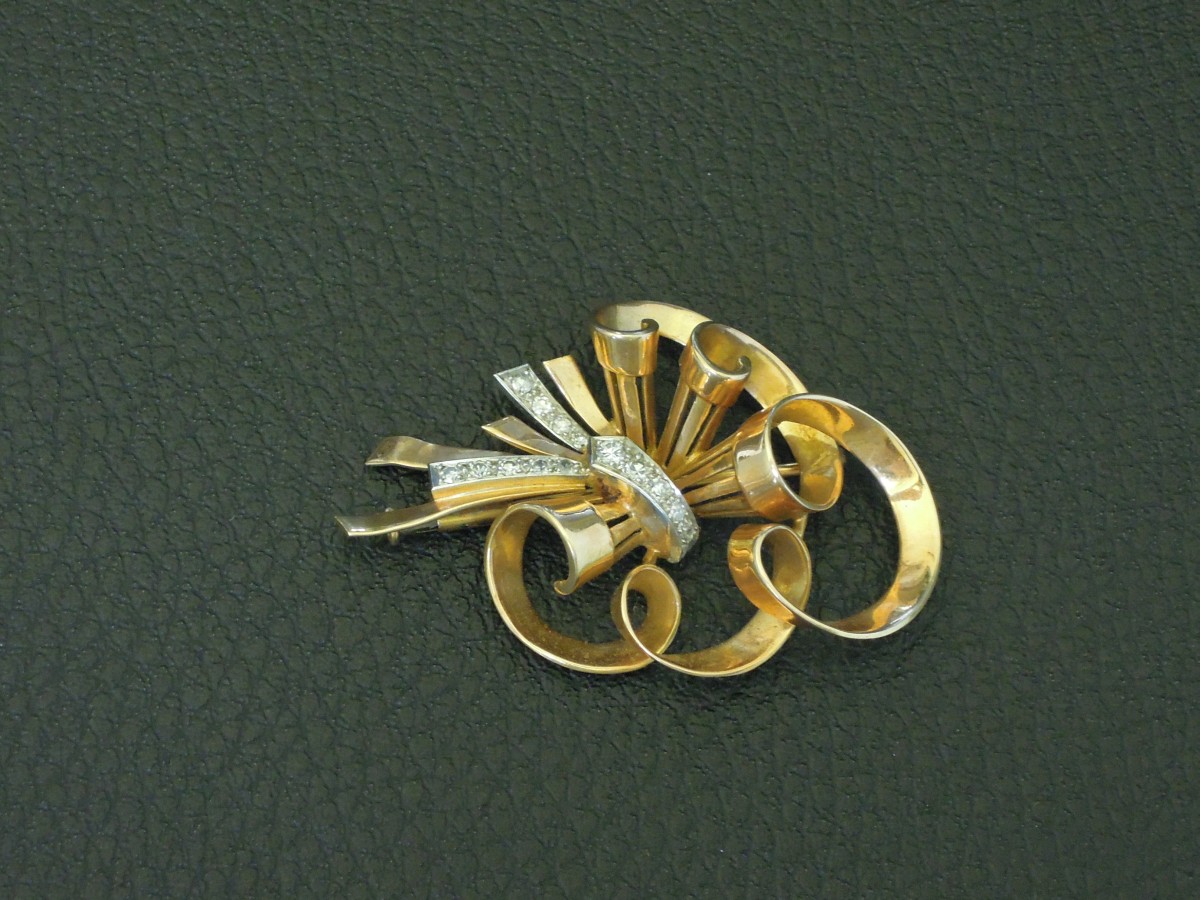 BROCHE NOEUD en or jaune pavée de 14 petits brillants.