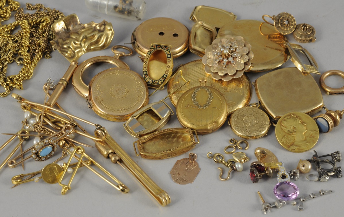 29 ÉLÉMENTS en or (?) broche, boîtiers de montres, or dentaire... Poids brut: supérieur à 60 g.