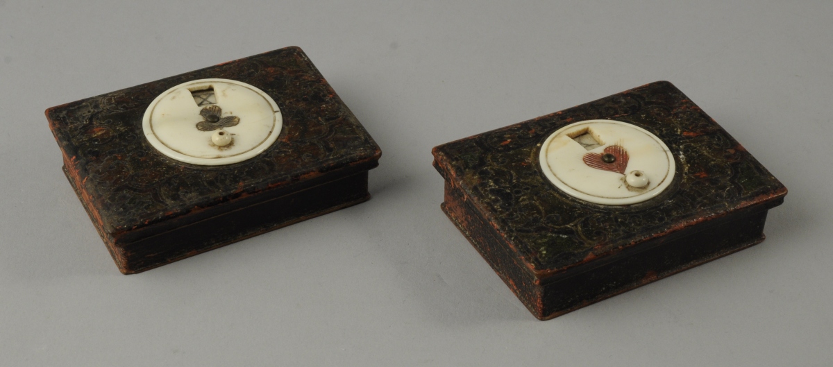 Paire d'ÉTUIS-COMPTEUR pour CARTES À JOUER en bois, de forme rectangulaire, garnis d'un papier laqué à la façon de l'écaille de tortue. Au centre de chaque couvercle une pièce d'os circulaire gravée d'un coeur rouge pour l'une et d'un trèfle noir pour l'autre pivote afin de marquer dans une fenêtre 10 points successifs en chiffres arabes et romains. Charnière de laiton.