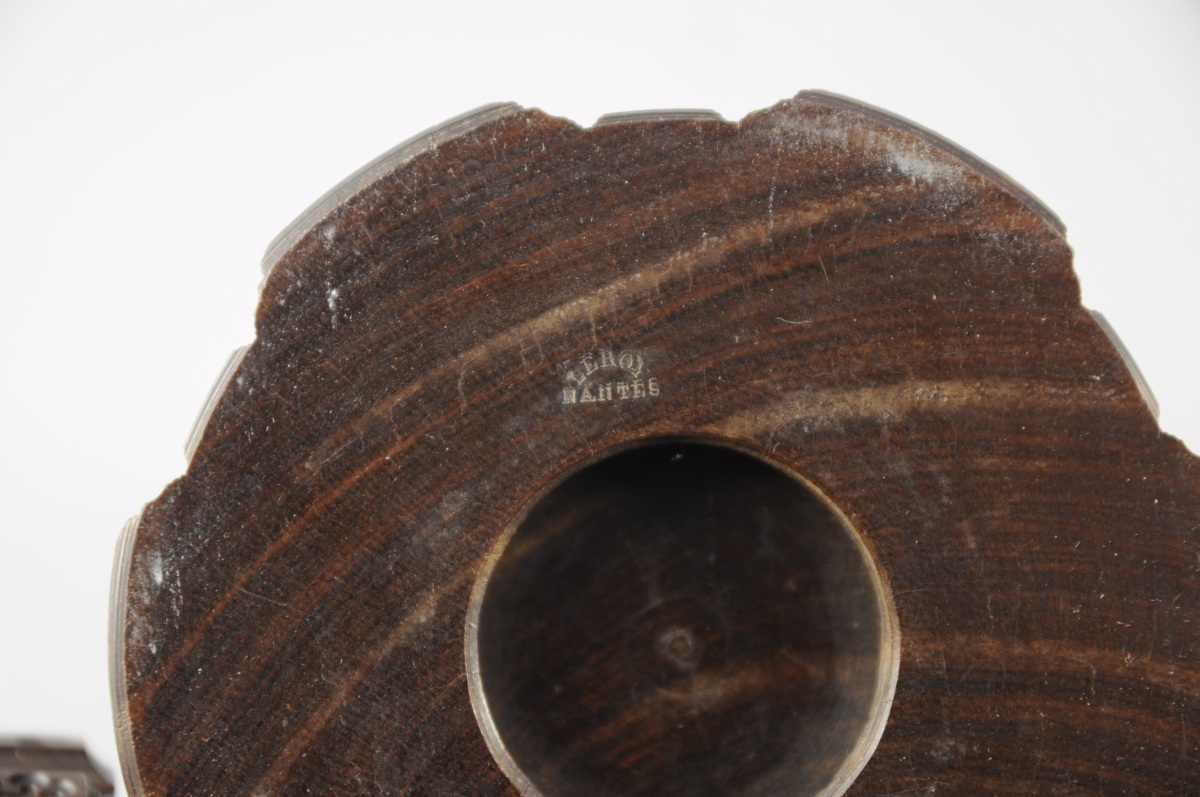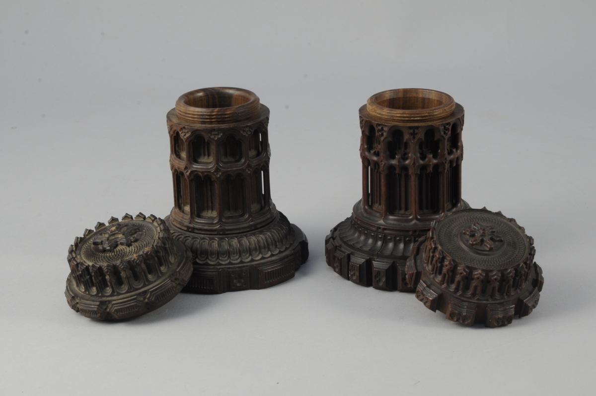 DEUX BOÎTES en bois exotique mouluré et sculpté. Décor de fenestrages de style néogothique. La base et le couvercle se dévissent.