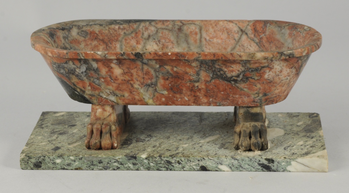 VIDE-POCHE figurant une BAIGNOIRE À L'ANTIQUE en marbre veiné rose et vert (porphyre?), reposant sur quatre pieds griffes sur un socle rectangulaire de marbre vert.
